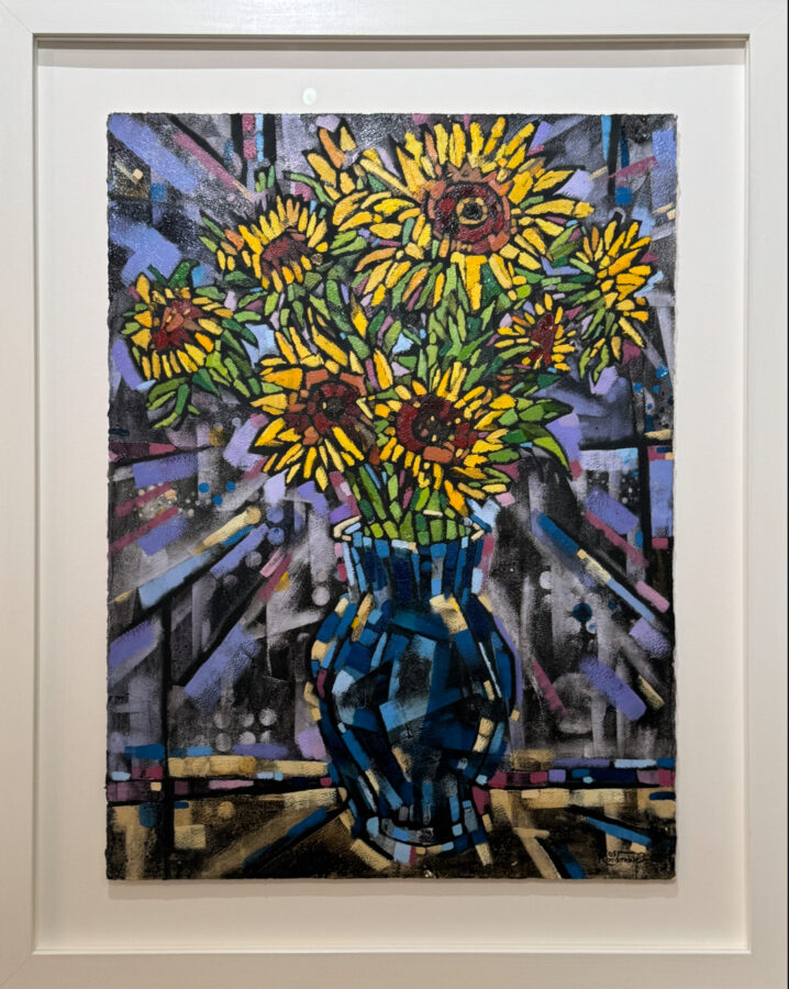 Inspired by Van Gogh’s sunflowers, Ross tackled the iconic sunflowers having visited the Basque region of Spain and having seen the beautiful flowers in abundance. As is often the case with Ross’ floral studies, the composition reflects the artists sense of being broken during his illness but then reflects the positivity of rebirth aided by nature through the vibrant flowers.