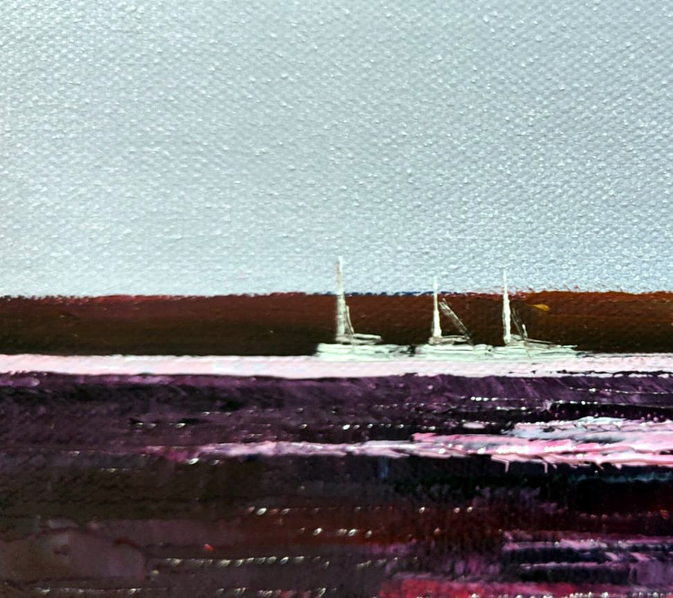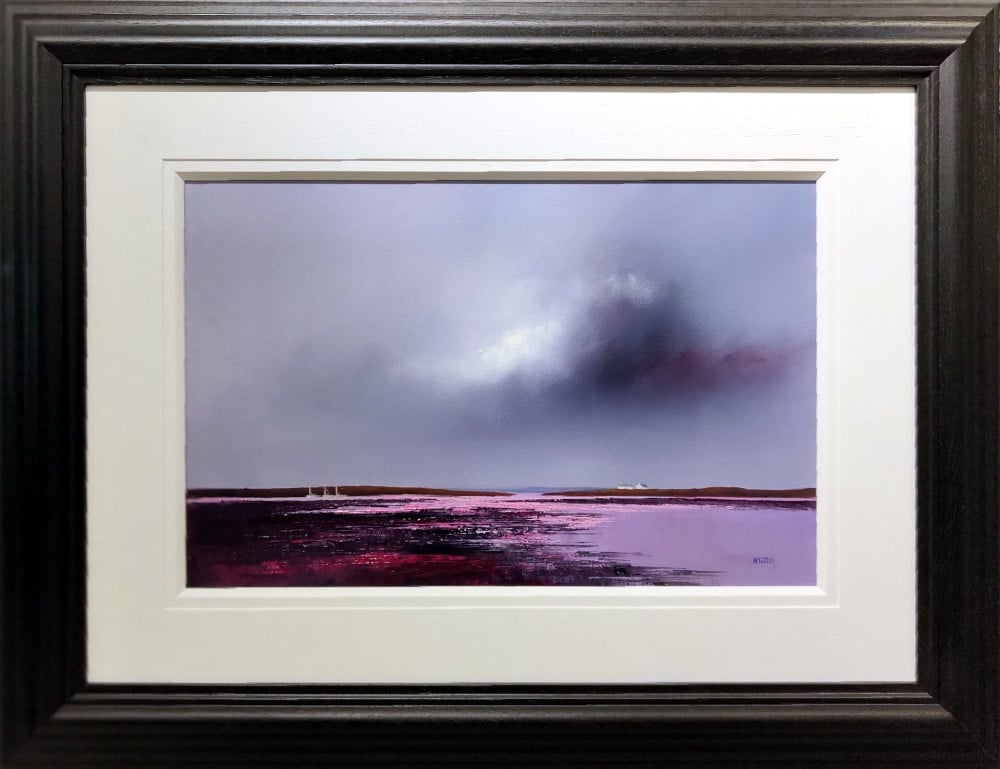 The earth reflects the sky, and the sky reflects the earth in this work by Barry Hilton. The cottage which features in most of Barry Hilton’s paintings is accompanied by sailing boats on tranquil waters. A lovely piece.