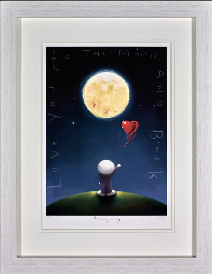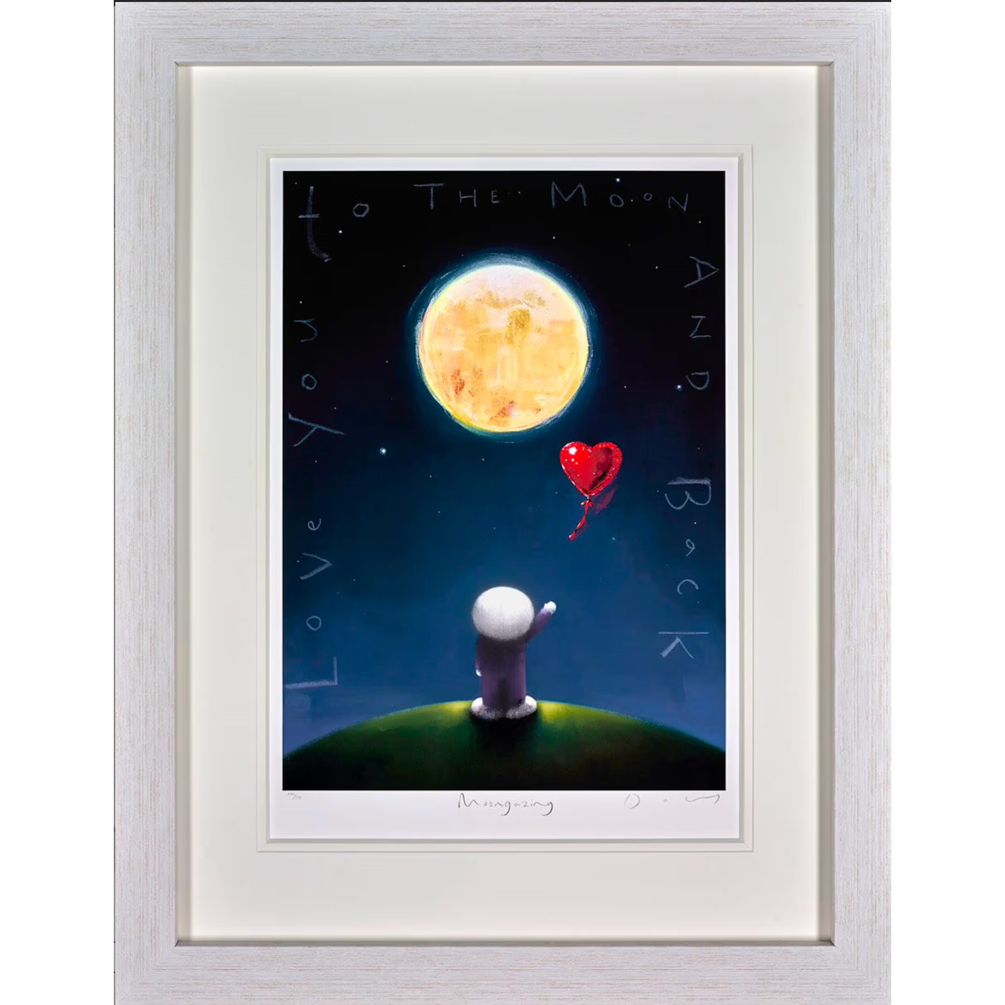 Moongazing by Doug Hyde invites us into a peaceful night-time world of wonder. Beneath a glowing full moon, his beloved smiling figure gazes skyward from a quiet hillside, as a red heart-shaped balloon floats above in an indigo sky full of stars. The phrase “to the moon and back” – from the cherished children’s book ‘Guess How Much I Love You’ – is written around the edge in Doug’s distinctive handwriting. Poetic and reflective, this limited edition print of 295 is part of the ‘Days Like These’ collection. Image size 16 x 22”; framed size 29 x 35”.