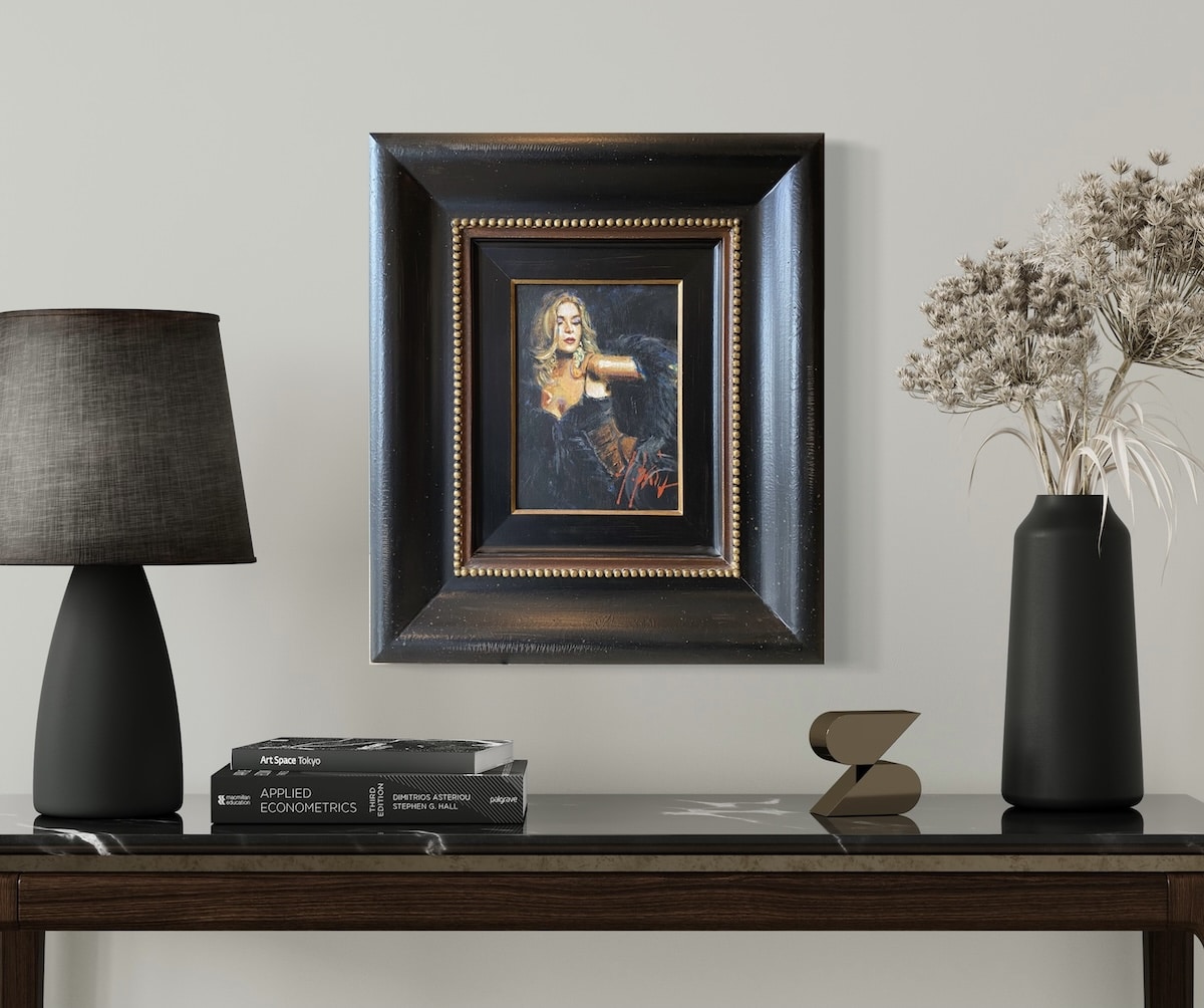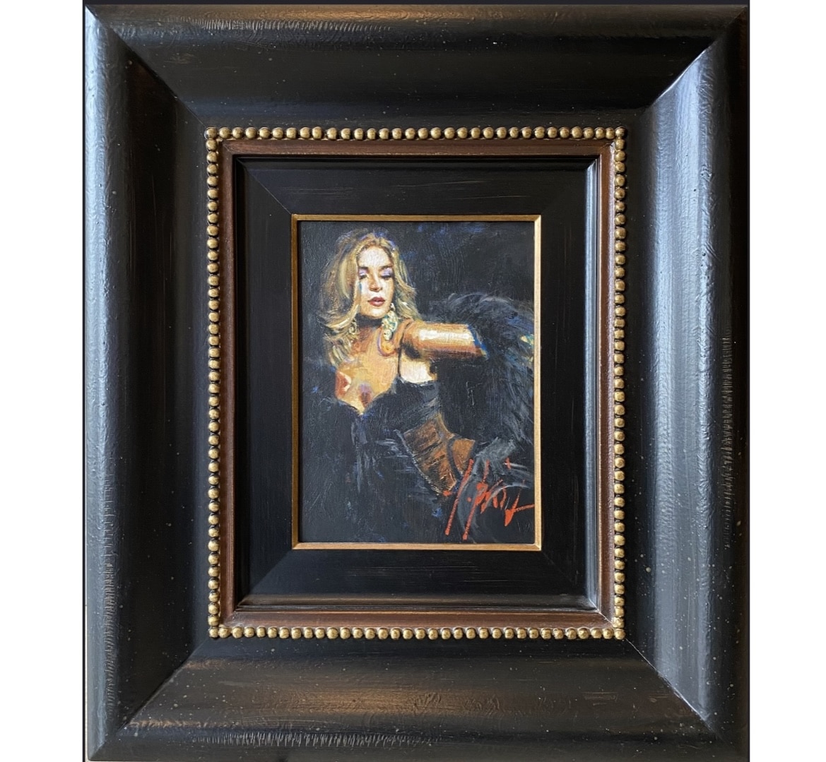 Lori with a Black Hat is an original painting by South American art sensation Fabian Perez. Unusually for Fabian Perez, the model in this stunning painting is blond making it somewhat rarer than many of his dark haired South American studies.
