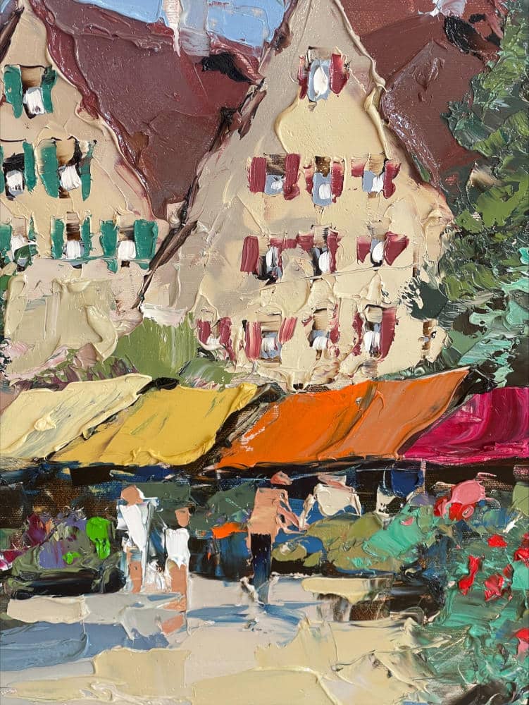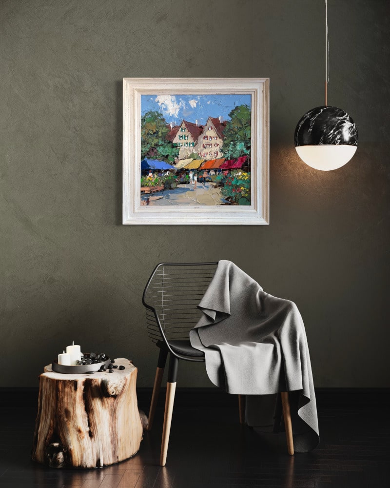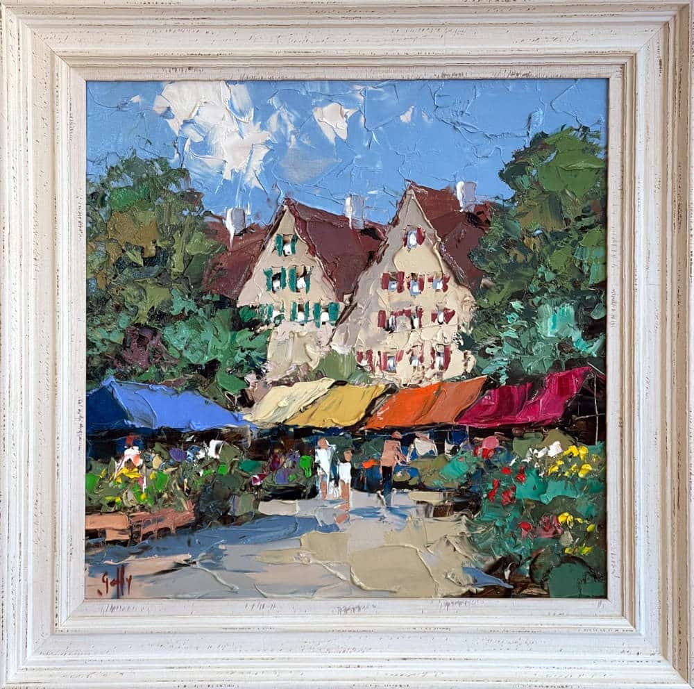 An original oil painting by German artist Frank Getty. Using his stunning impasto technique, the market stalls sit within the village square with the vibrancy of the colour palette being truly stunning.  Signed by the artist and professionally framed.