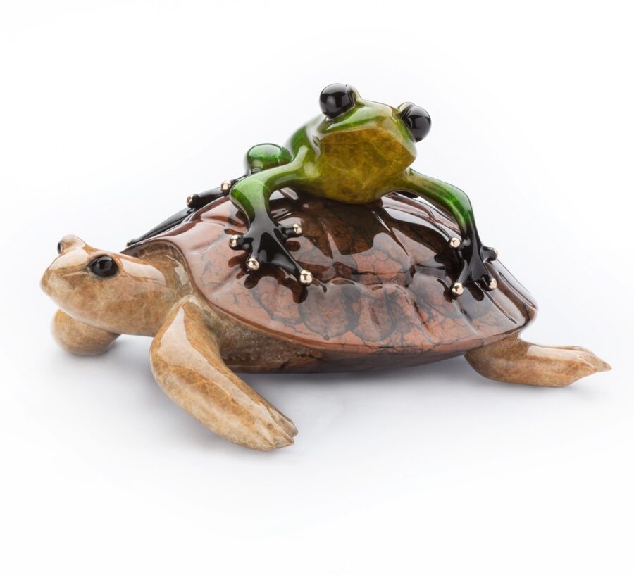 The tired green frog hitches a ride on the back of the tortoise on this unusual frogman sculpture titled Easy Rider. Larger in person than the images suggest, this is a striking sculpture and fabulous addition to any Frogman collection.