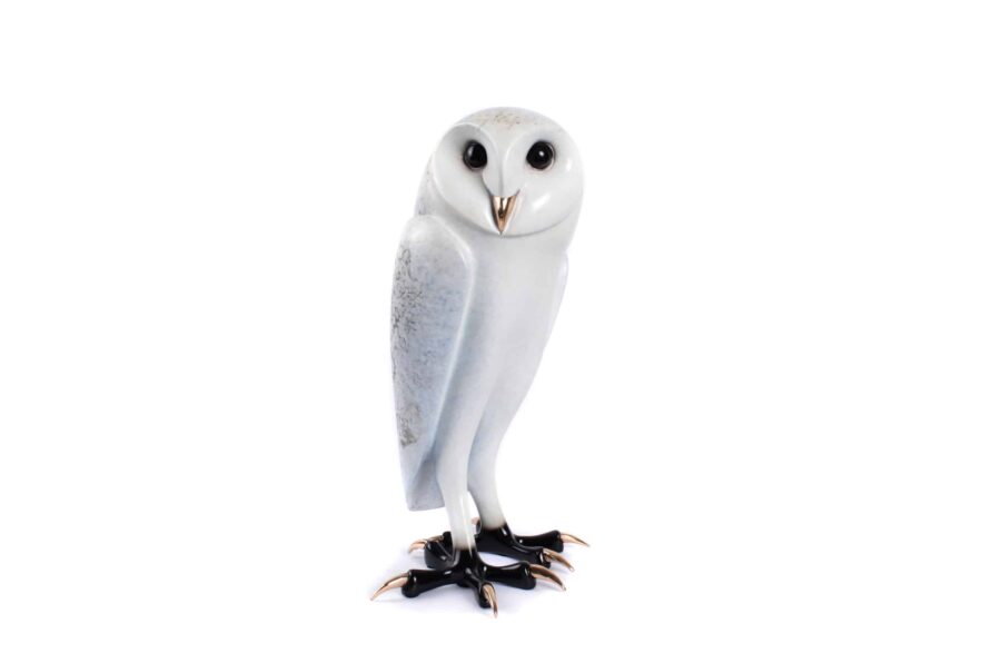 Obviously, owls are a most favoured subject matter for Tim Cotterill. Having sculpted them since 1972, he is fascinated by their beauty, character, and personality – and reminds us that, remarkably, they are the only birds with forward facing eyes. In an effort to stylise the sculpture and accentuate the barn owl’s traits, Tim intentionally exaggerates the size of the feet and the talons. All of the details have been stripped away, never compromising the message. The beauty, the character, and the personality of this fine example of its species, comes through loud and clear!