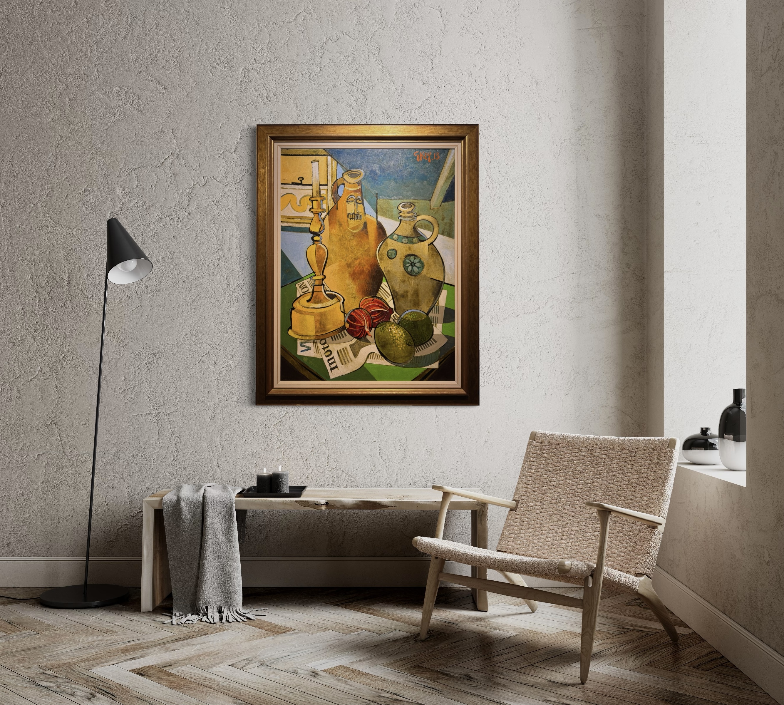 A striking and large still life composition by Salford artist Geoffrey Key. The painting features a Bellarmine Jar (also known as a Bartmann jug) which is a type of salt-glazed stoneware vessel that was popular in Europe—especially in Germany and the Low Countries—during the 16th and 17th centuries. These vessels feature a bearded face mask on the neck or shoulder, often grotesque or comical and amazingly this painting is accompanied by the Jar featured in the painting.