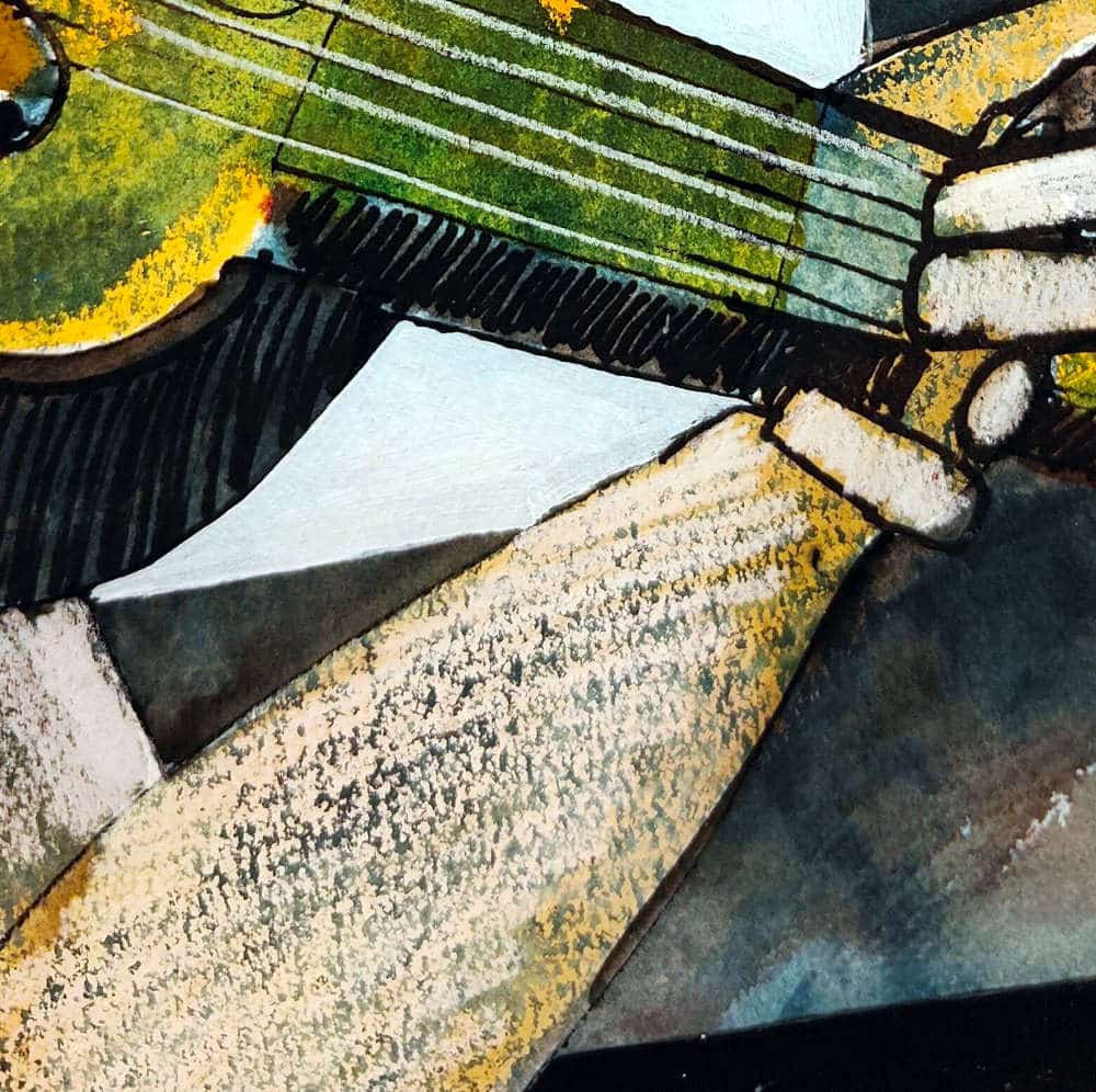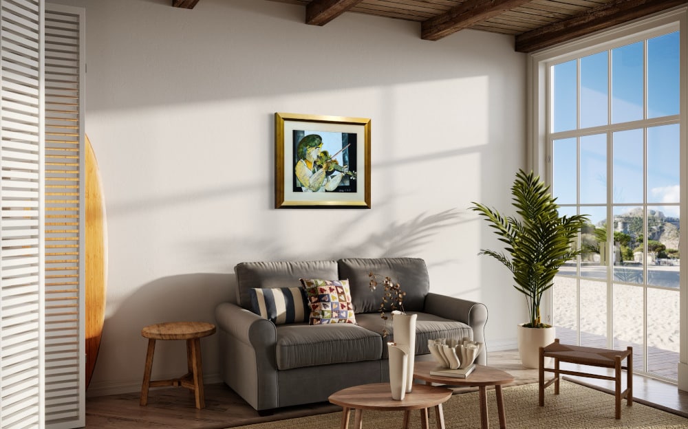 Dating from 2007, a rare composition in mixed media by Geoffrey Key. In this piece, Geoffrey depicts the figure playing a violin at an open window, an image that demands the viewer’s attention. The artist’s signature also includes the full date for the piece.