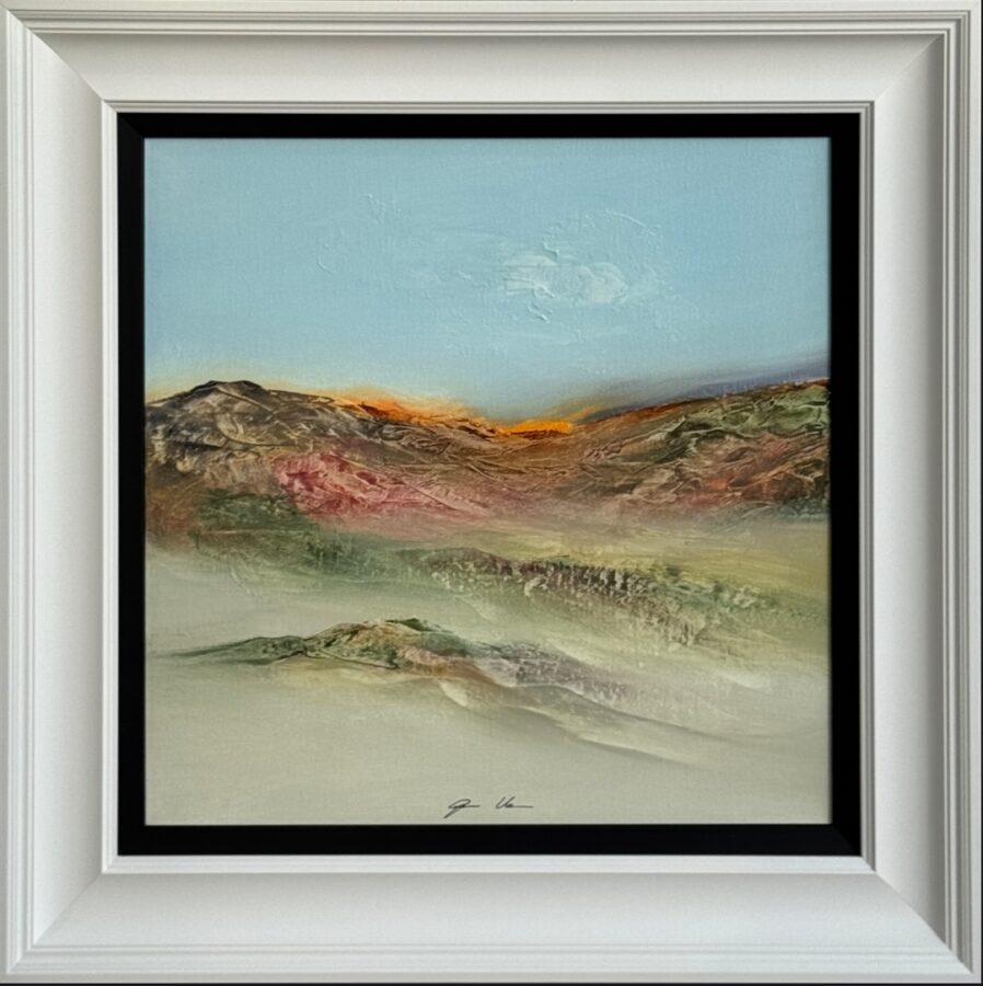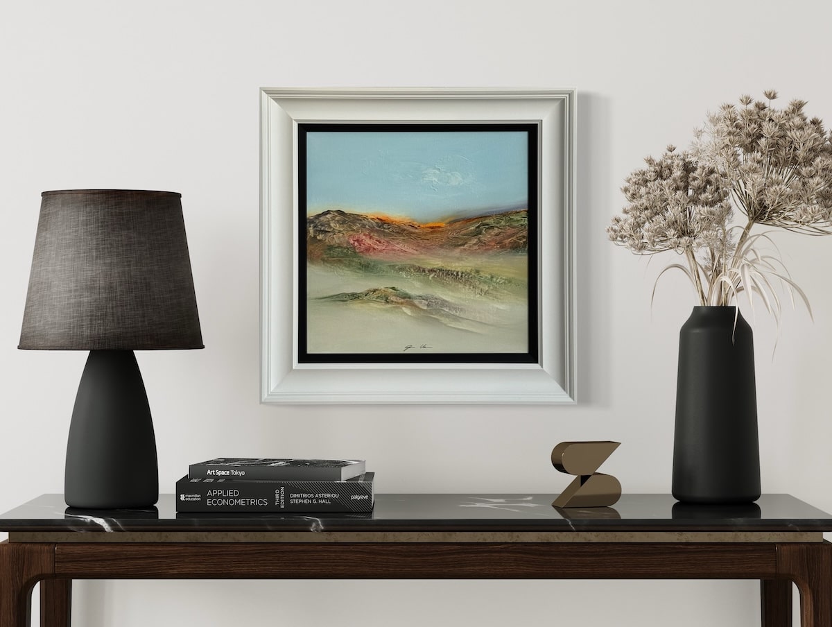 Original abstract landscape painting by German artist Gisela Ueberall. Provided professionally framed in a matt white frame with black slip and signed by the artist.