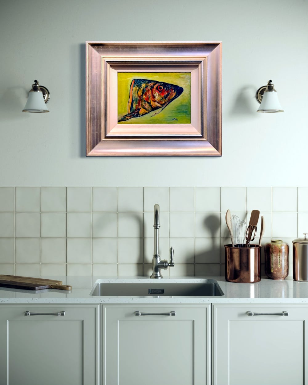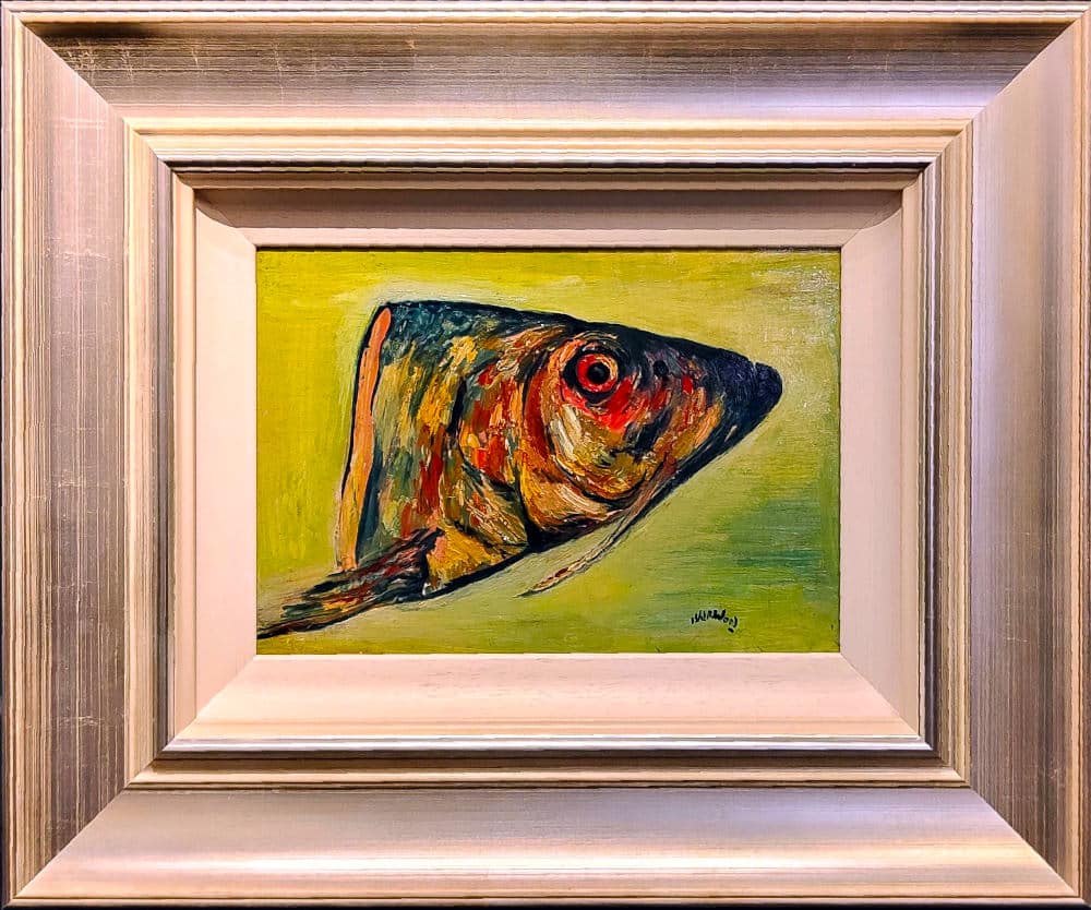 A rare and exquisitively painting original oil on board painting by the late Wigan artist, James Lawrence Isherwood. Although Isherwood repeated many subject matters throughout his life, this early study of a fish’s head is one of the only ones known to exist and demonstrates incredible brush work and a true eye for handling colour and paint. This painting really does have to be examined close up in person to fully appreciate the quality of brushwork at play.