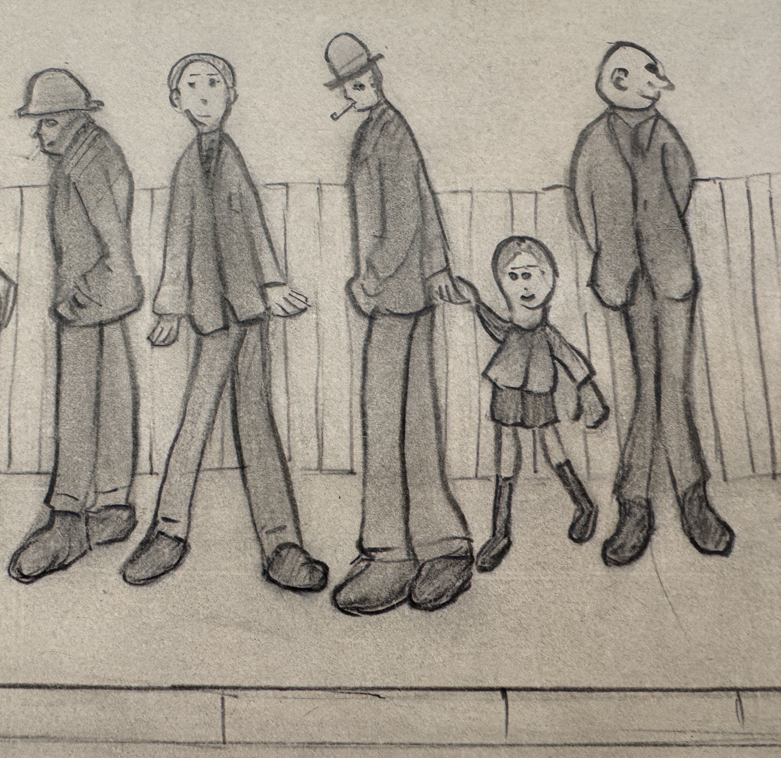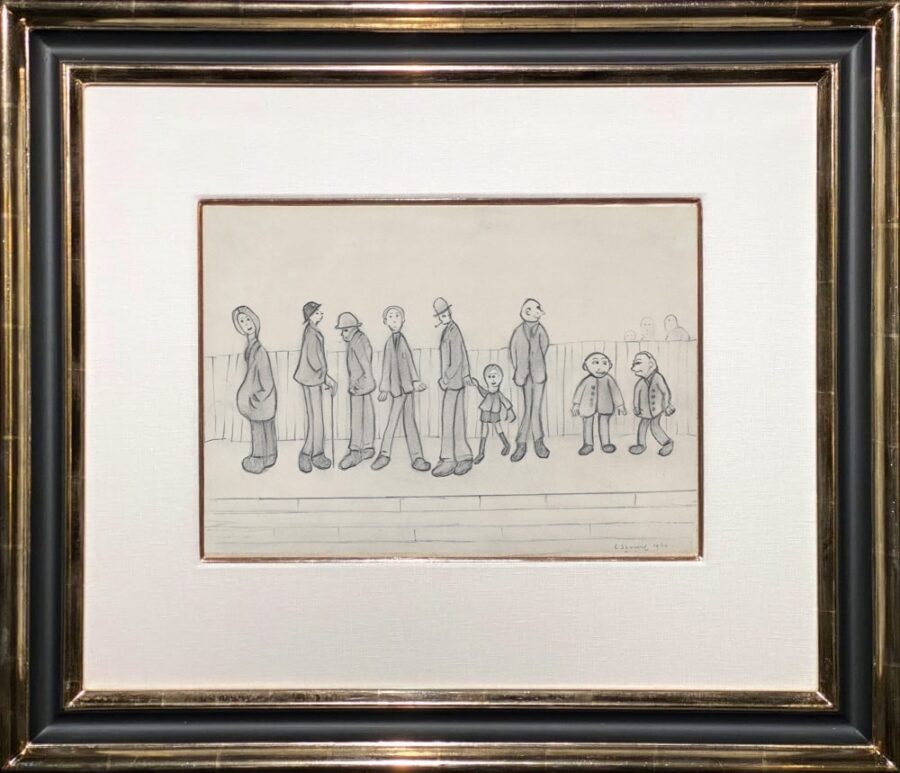 Lowry’s friend, Edwin Mullins, recalls sitting with the artist in Manchester’s Piccadilly Gardens, in the 1960s and asking him why he was so fascinated by crowds. Lowry replied; People think that crowds are all the same. But they’re not, you know. Everyone’s different. Look! That man’s got a twitch. He’s got a limp. He’s had too much beer. That woman, she’s angry with her child. Those two have had a row; you can see it from their faces. It’s wonderful, isn’t it? The battle of life, sir. That’s what it is. The battle of life. (T.G. Rosenthal, L.S Lowry, The Art and The Artist, Norwich 2010, p.183) Indeed, the art critic, John Berger, wrote about Lowry’s figures in 1966, two years after the present work was executed, that; The character of figures and crowds is also especially English. The industrial revolution has isolated them and uprooted them. Their home-made ideology, except when they are lead and organised by revolutionaries, is a kind of ironic stoicism. Nowhere else do crowds look so simultaneously civic and deprived. They know each other, recognise each other, exchange help and jokes – they are not, as is sometimes said, like lost souls in limbo; they are fellow-travellers through a life which is impervious to most of their choices.(John Berger, ‘Lowry and the Industrial North’, published in New Society, 1966)