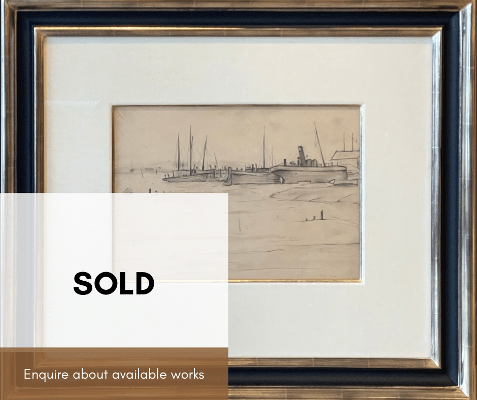 An exquisite early original pencil drawing by the legendary northern artist L S Lowry of Rhyl. A frequent visitor to North Wales throughout his life, Lowry particularly enjoyed painting this area throughout the 1920s when he was a regular visitor. Capturing the quiet scene with the moored boats and a number of fishermen, this is a fine example of the period when Lowry’s works were more detailed than later sketches and compositions.