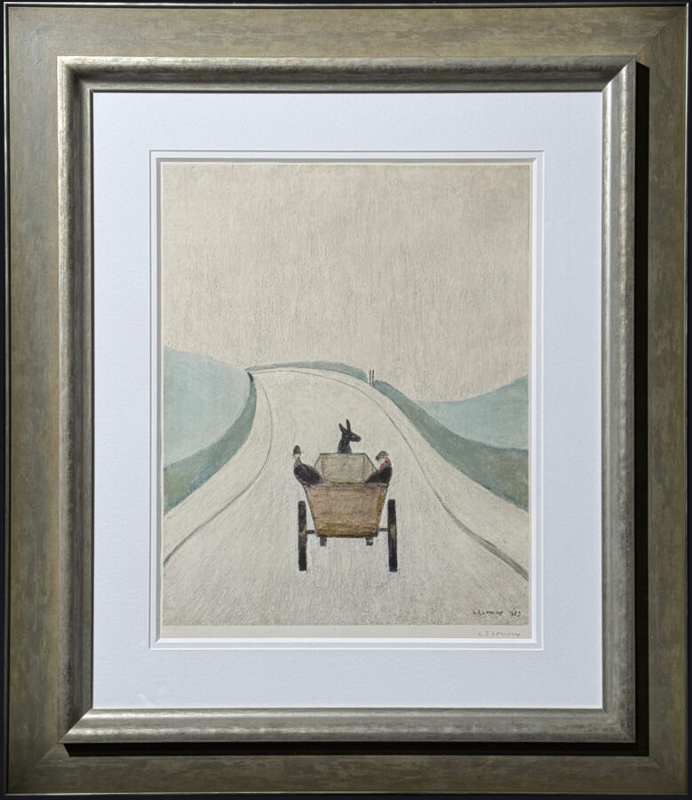 This limited edition print of L.S. Lowry’s The Cart captures a wonderfully understated yet evocative moment, characteristic of Lowry’s unique observational style. The composition is simple and spacious: a quiet, pale roadway winds gently into the distance, flanked by soft, rolling hills rendered in muted greens and blues. At the centre of the scene, a small wooden cart travels along the empty road, carrying two figures. Their forms are stylised in Lowry’s familiar manner—slender, minimal, and expressive despite their simplicity. Unlike Lowry’s busy industrial street scenes, The Cart feels intimate and pastoral, focusing on a moment of travel, solitude, and gentle movement through the landscape.