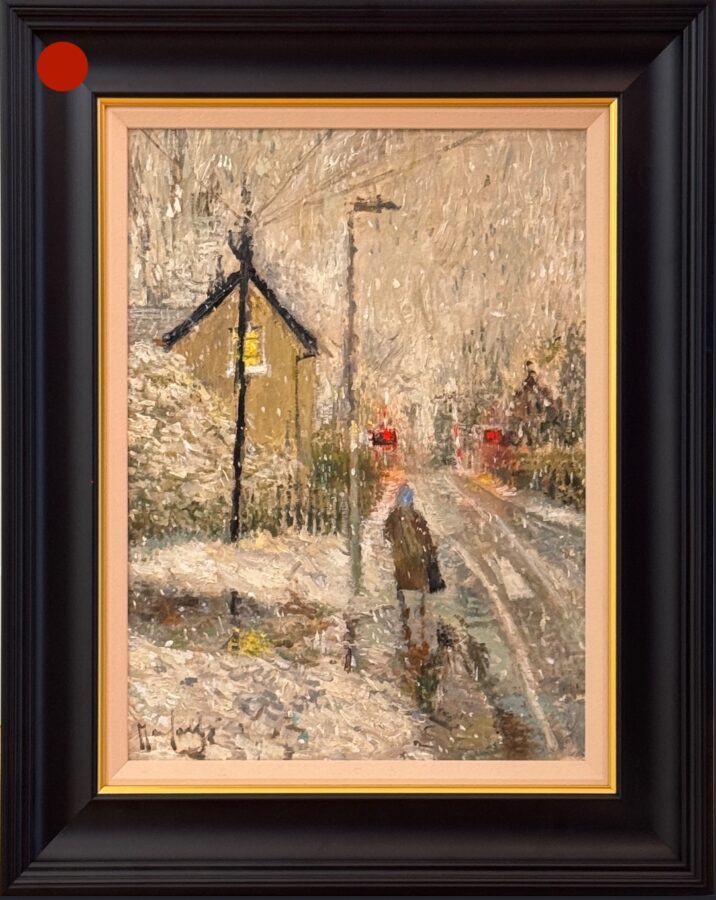 An eye for composition and colour that is impossible to teach, Lucy Manfredi instinctively knows wonderful subject matter for a painting when she sees it. In this wonderful original painting, the lady looks down the road in the first snow, drawing in the viewer to such a wonderful English scene.