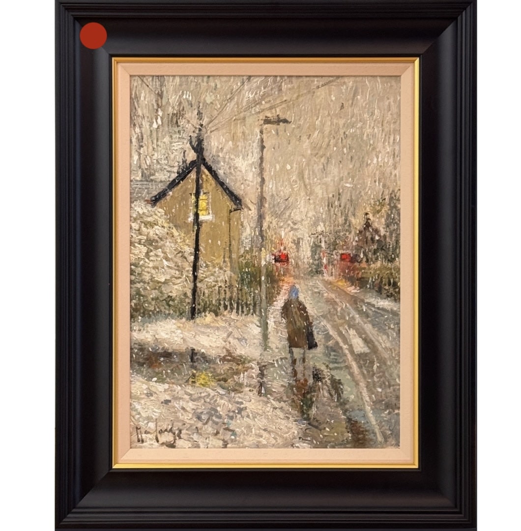 An eye for composition and colour that is impossible to teach, Lucy Manfredi instinctively knows wonderful subject matter for a painting when she sees it. In this wonderful original painting, the lady looks down the road in the first snow, drawing in the viewer to such a wonderful English scene.