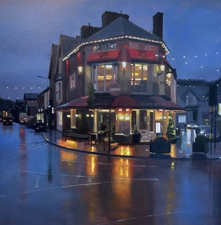 Although a classic rainy night scene from Michael Ashcroft, in this striking original work Michael heads further north than normal to the incredibly well known town of Bowness on Windermere, immortalising Cafe Italia in his recognisable signature style.