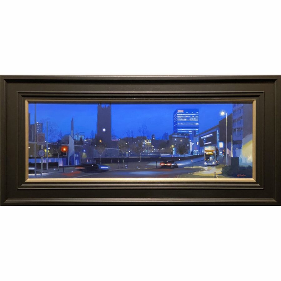 Original oil on board painting by Lancashire artist Michael John Ashcroft. Manchester is a favourite subject of Michael’s being his home city and he captures it so well. Sometimes picking iconic city views and often more day to day compositions, he depicts the rhythms of city life so well.