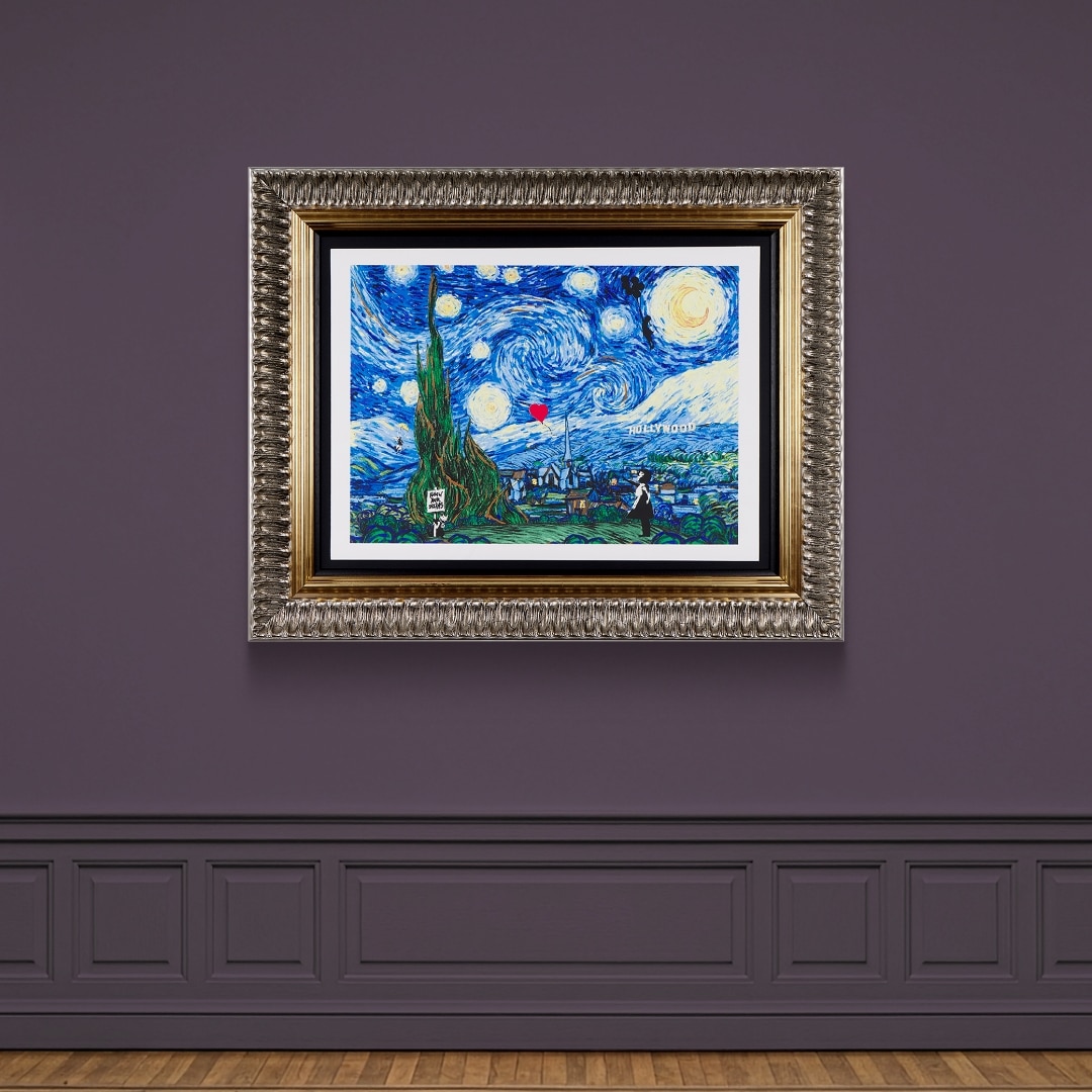 Starry Nights, Hollywood by Mr Brainwash is a bold silkscreen paper edition that playfully reimagines Vincent van Gogh’s iconic Starry Night through the lens of contemporary pop culture. Set against the swirling skies and expressive landscape inspired by the original masterpiece, the composition introduces unexpected modern references, including the unmistakable Hollywood sign rising from a Provencale hillside. The result is a surreal collision of time and place, where the poetic landscape of Provence meets the spectacle of Los Angeles. Mr Brainwash’s layered colours and energetic textures amplify the movement of the night sky while adding subtle contemporary details that reward closer inspection. With an image size of 30 x 22”, the artwork offers a dramatic and immersive composition, beautifully presented within its ornate frame. Limited to an edition of 95, Starry Nights, Hollywood is a playful and irreverent homage that celebrates the enduring influence of Van Gogh while reimagining his world through a distinctly modern lens. Created as a playful contemporary homage after Vincent Van Gogh, these works are produced by Mr Brainwash and are not affiliated with or produced by Van Gogh or his estate.