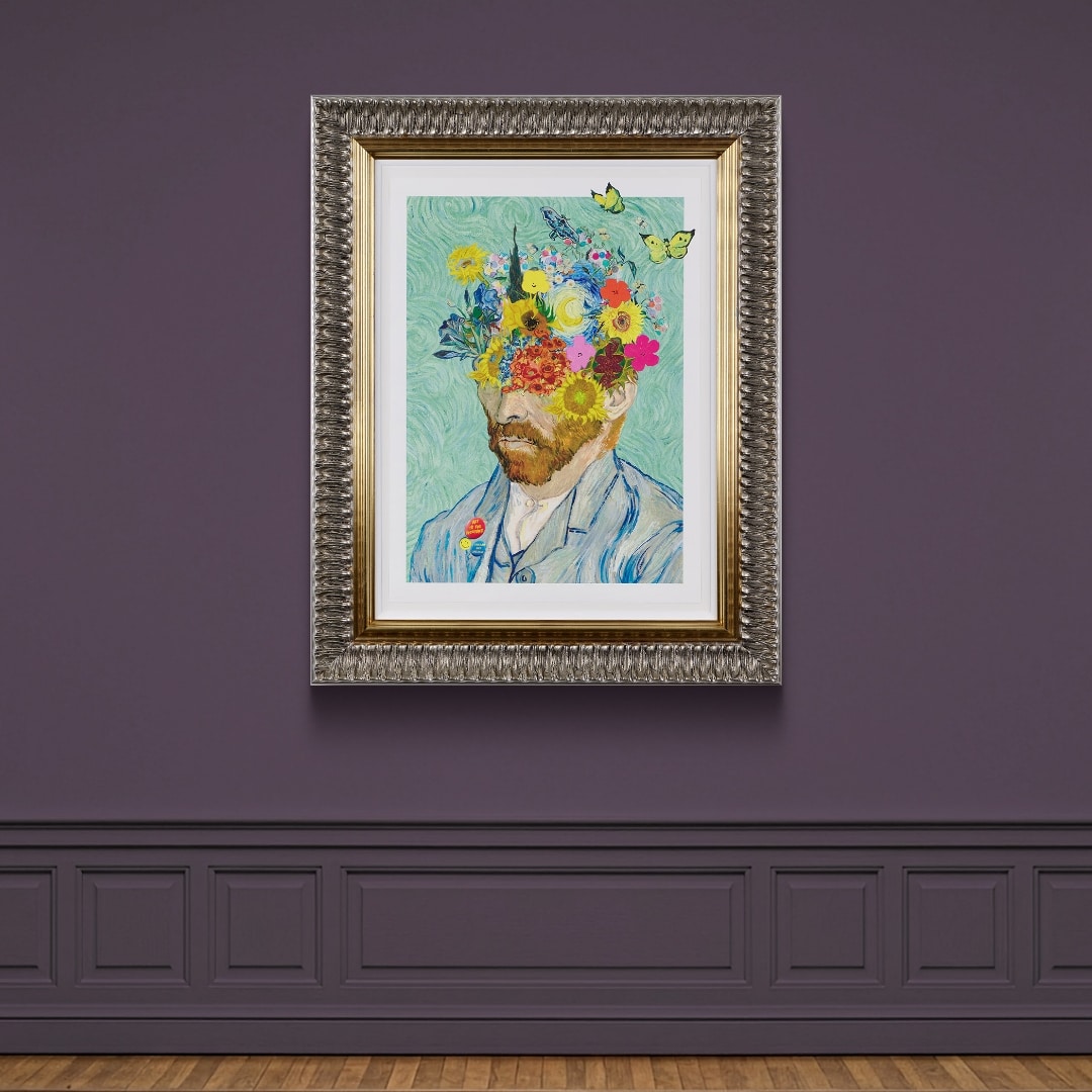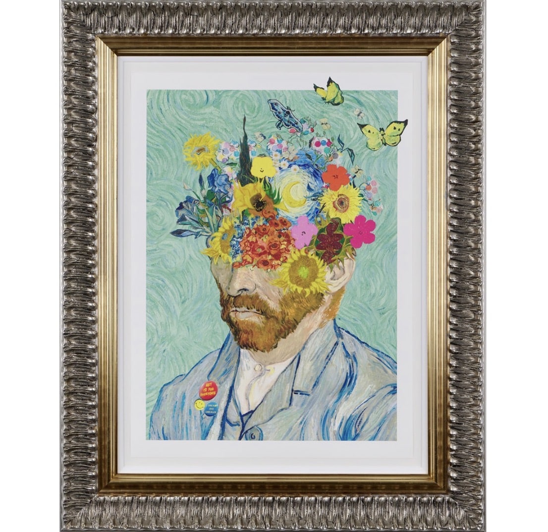 Where Ideas Flower by Mr Brainwash is a striking silkscreen paper edition that celebrates the creative legacy of Vincent van Gogh through a vibrant contemporary reinterpretation. The portrait depicts the legendary artist with an explosion of flowers growing from his head, blending his own botanical motifs with pop-inspired blooms and playful graphic elements. This imaginative composition symbolises the flourishing of artistic ideas across time, where influences from past masters, modern pop art and street culture intertwine. Mr Brainwash’s energetic palette and layered textures bring new life to the familiar image, transforming the portrait into a joyful meditation on creativity itself. With an image size of 22 x 30”, the artwork has a commanding vertical format that highlights the exuberant floral arrangement. Limited to an edition of 95, Where Ideas Flower is a bold tribute to artistic inspiration, celebrating the enduring power of Van Gogh’s vision through the exuberant style of Mr Brainwash. Created as a playful contemporary homage after Vincent Van Gogh, these works are produced by Mr Brainwash and are not affiliated with or produced by Van Gogh or his estate.