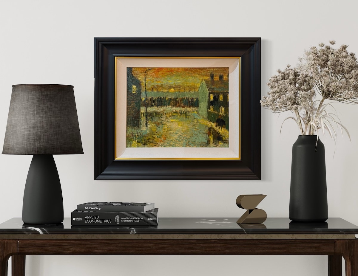An atmospheric townscape by Stockport artist Lucy Manfredi featuring a solitary figures trudging along the terraced streets. Lucy captures the homely warm exuding from each house so wonderfully well.