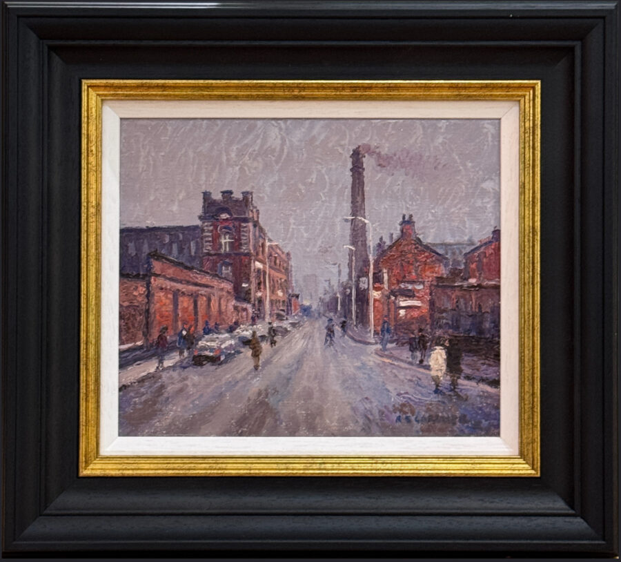 Original oil painting by highly collected Northern artist Reg Gardner. In this wonderfully nostalgic composition, Reg Gardner depicts Cambrian Street and the Beswick Mill, capturing a moment in time and recording an important part of Northern landscape and heritage.