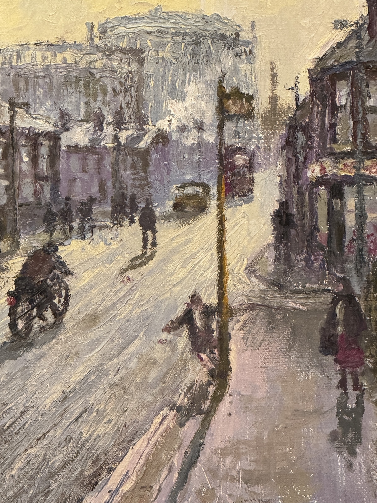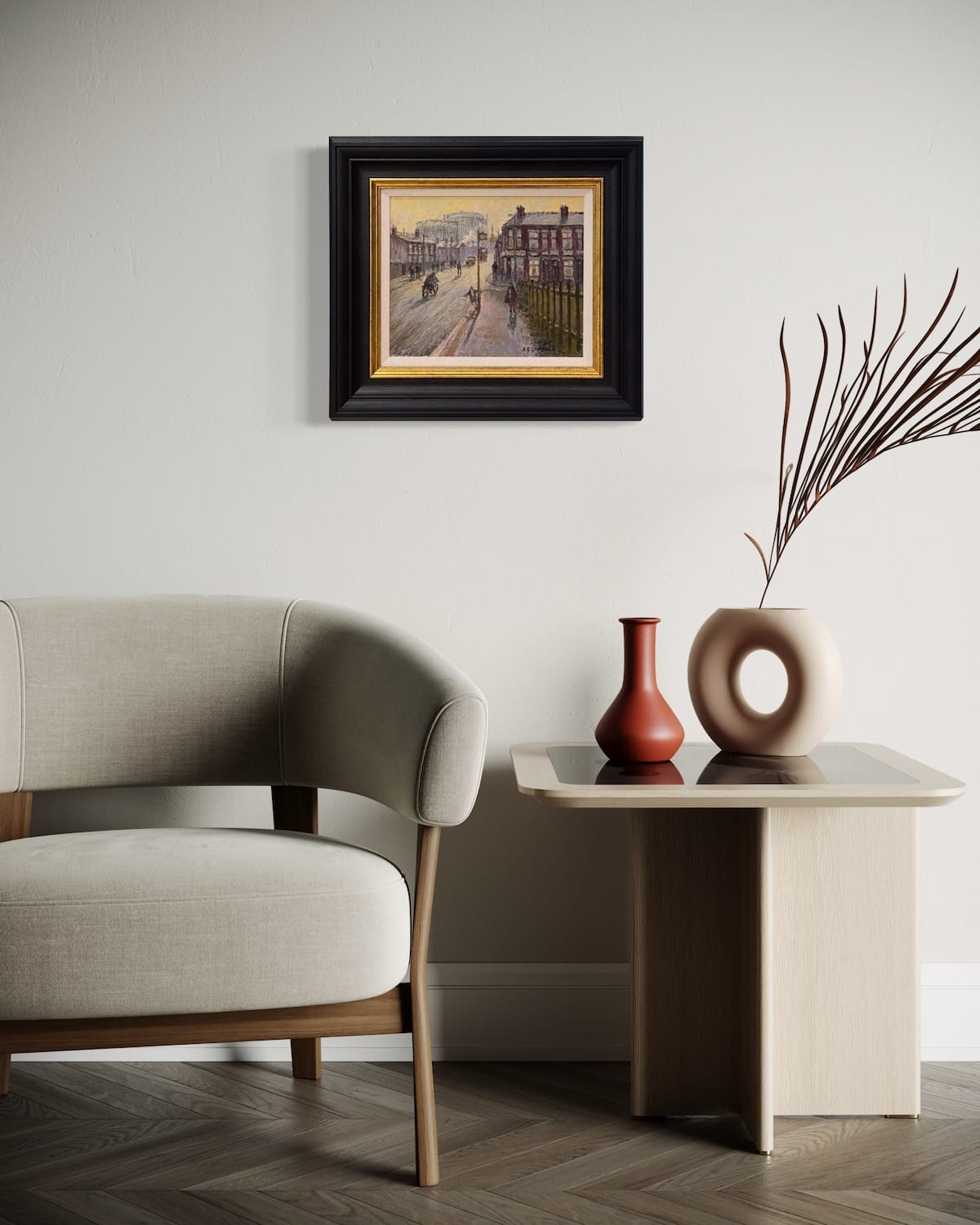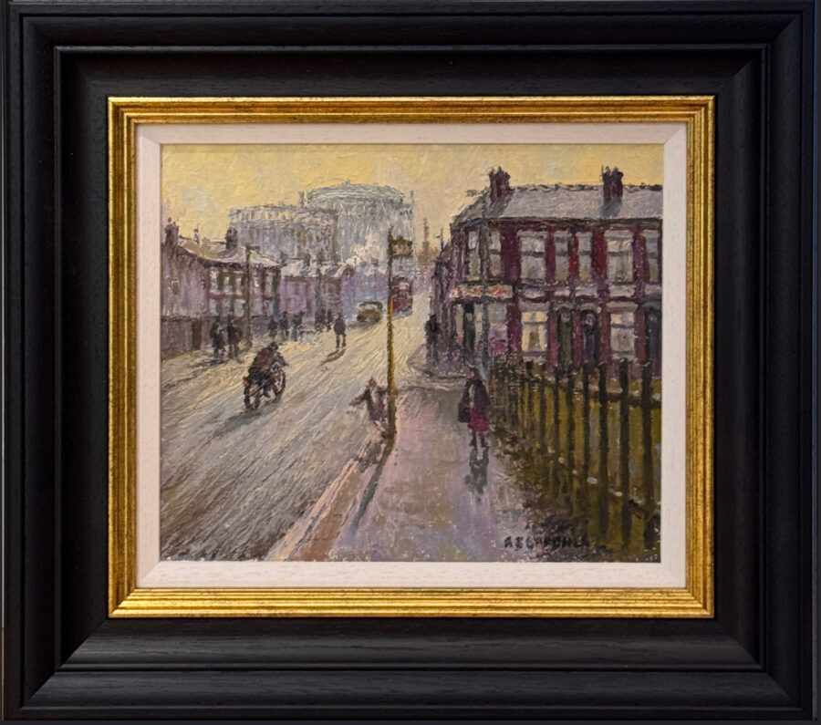 Original oil painting by highly collected Northern artist Reg Gardner. Life bustles on in the streets as the child swings around a lamp post and motorbike whizzes by, all in the shadow of the gas station behind. Nostalgia Reg Gardner style.