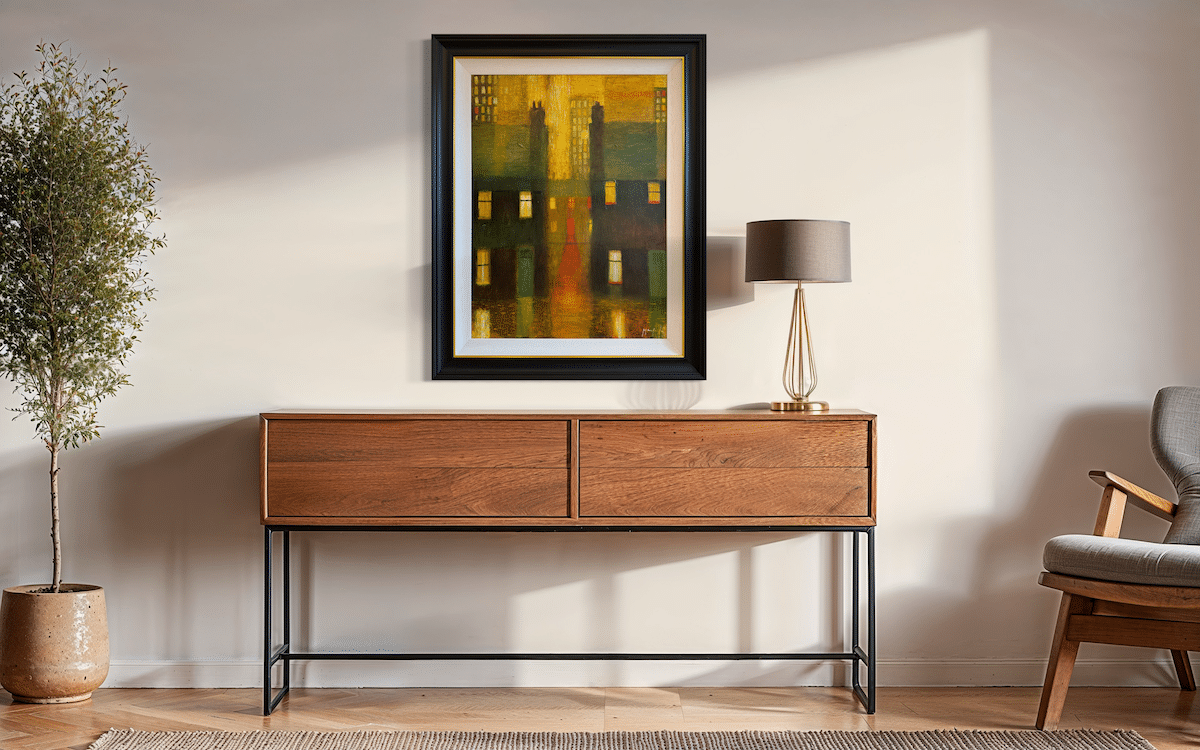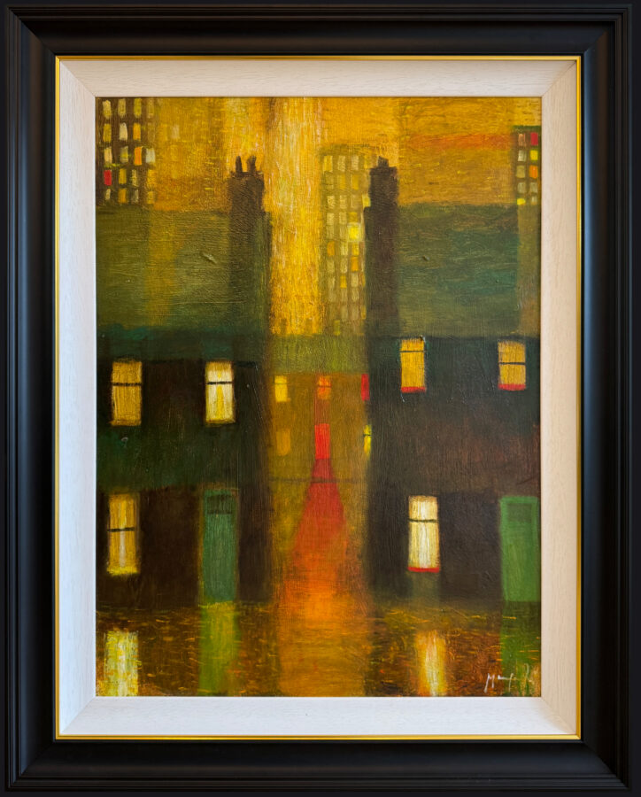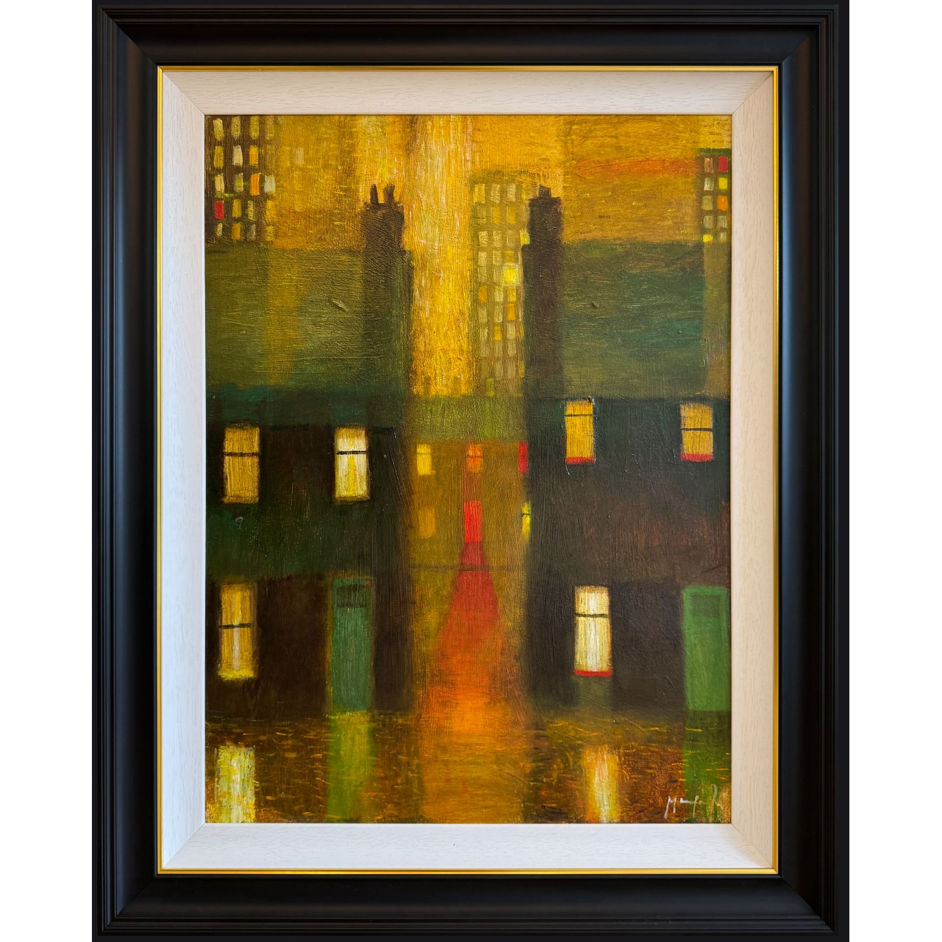 In the shadows of the modern high rise buildings, Lucy Manfredi creates a wonderful intrigue by capturing the lights spilling from the terraced houses.  A fabulously evocative painting by the talented North West based artist.