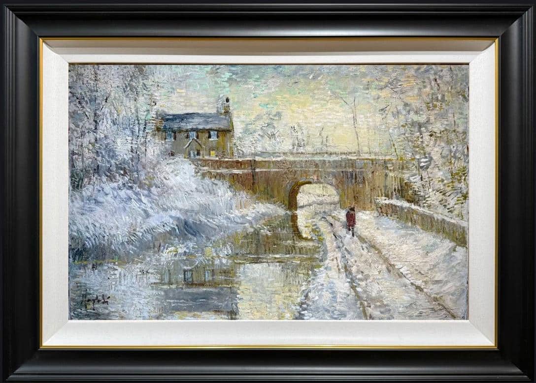 The timeless charm of the British waterways is captured in Lucy Manfredi’s latest beautiful composition. The warmth of the winter sky breaks through against the snowy Marple canal scene as the solitary figure finds a moment of peace on their walk.