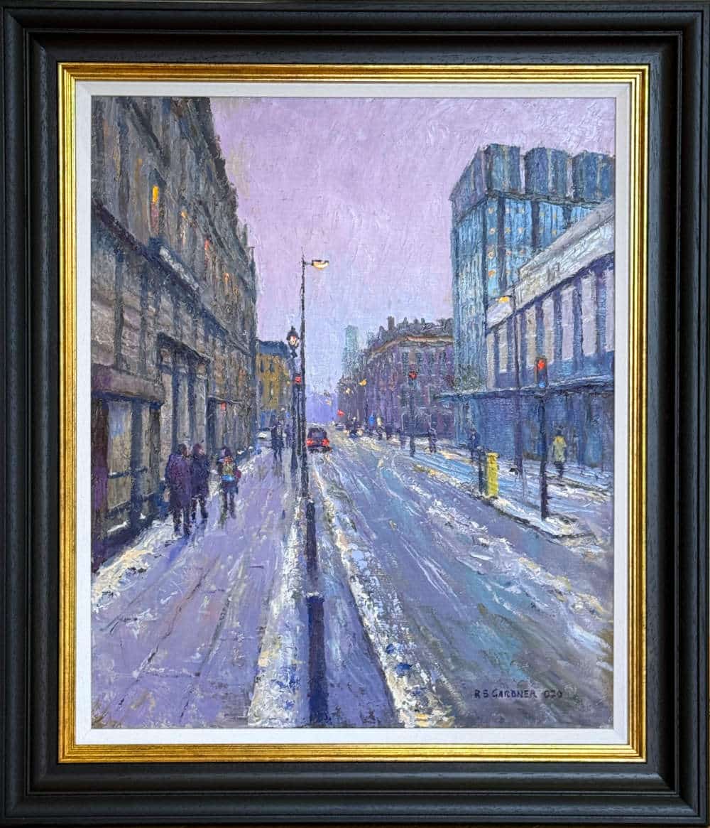 Original oil painting by highly collected Northern artist Reg Gardner. A winter’s day in Manchester city centre, as snow hangs heavily in the sky overhead.