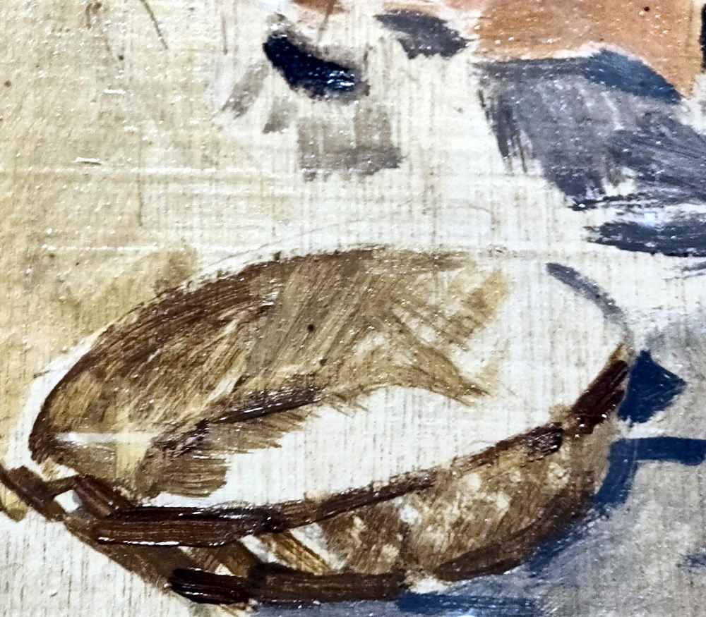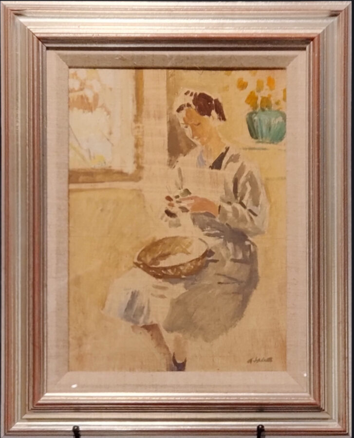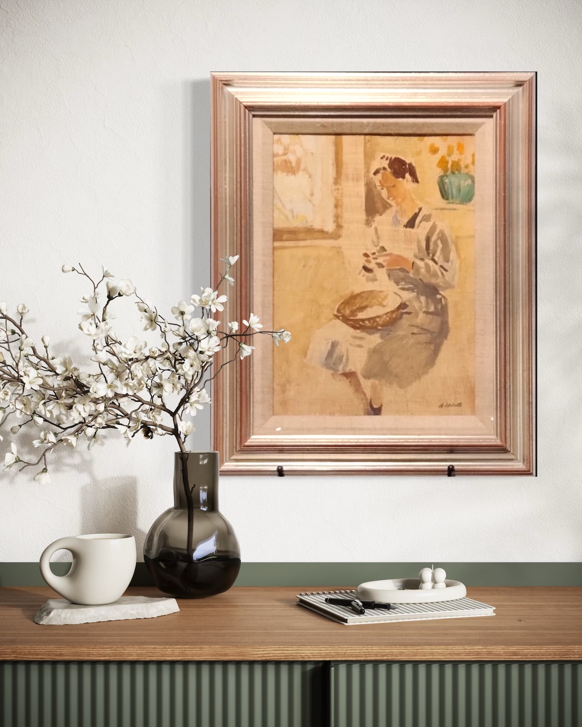Most of Valette’s figurative works were produced in his early years, influenced by his academic training in France. Despite his shift toward atmospheric urban scenes during his time in England he continued to engage with figurative art, especially in his teaching. This particular piece is a lovely example of his figurative work that also demonstrates his ability to capture light and mood with very little paint.