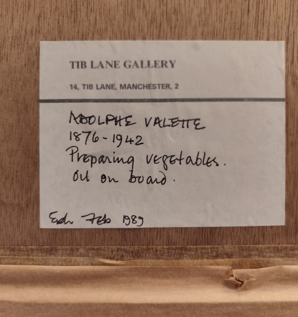 Preparing Vegetables comes professionally framed and glazed, with a ‘Tib Lane Gallery’ label verso; this gallery was a key venue for exhibiting modern and contemporary art in Manchester, and it played a significant role in the Manchester art scene (the gallery closed in 1977). Do come to our Heskin Gallery now to view this wonderful piece of northern art history or contact us for further details.