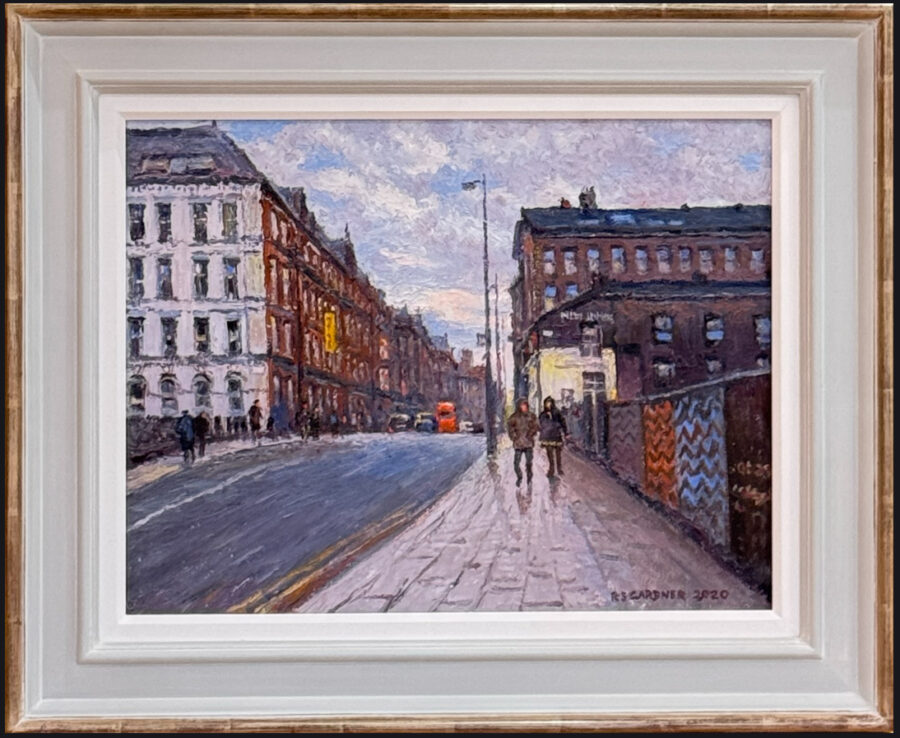 Original oil painting by highly collected Northern artist Reg Gardner. Manchester in the rain, once of the best ways to paint this wonderful city.