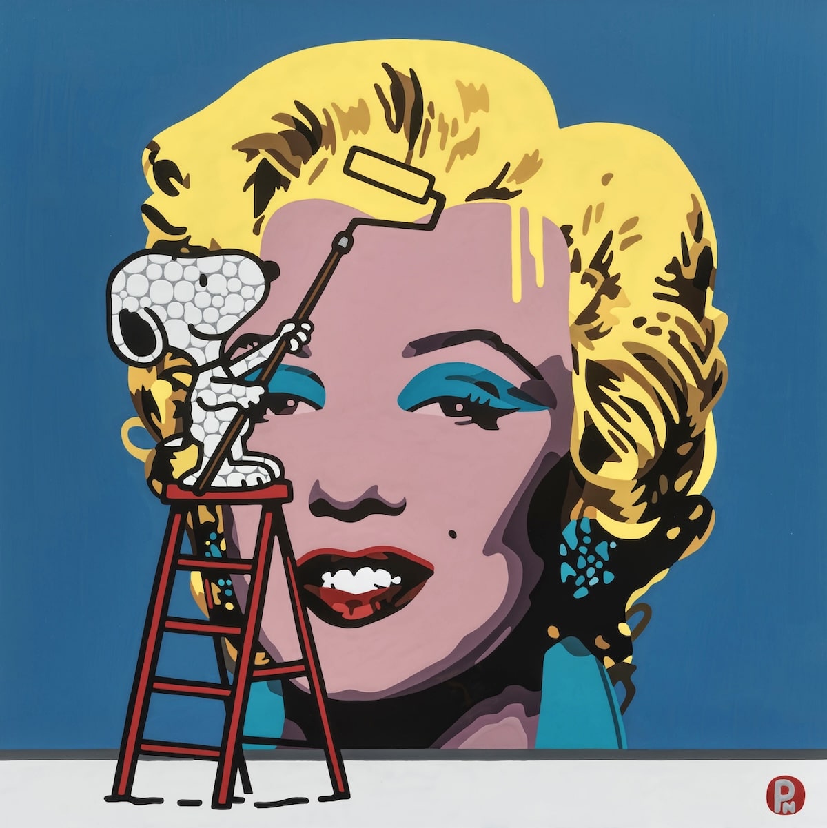Snoopy takes on andy Warhol’s iconic Marilyn Monroe image in this fabulous original painting.