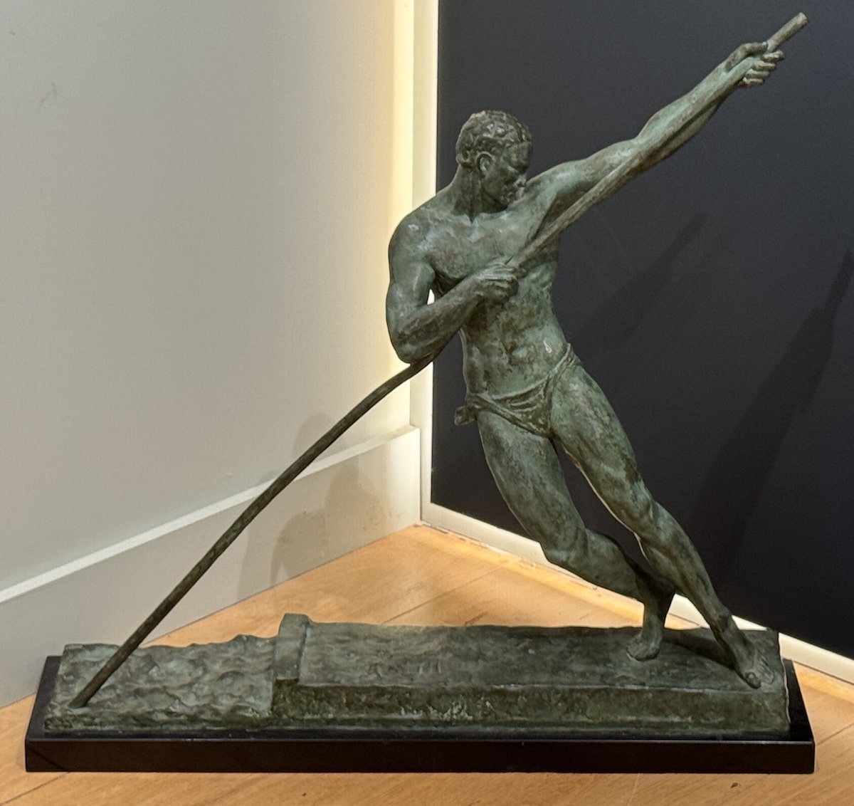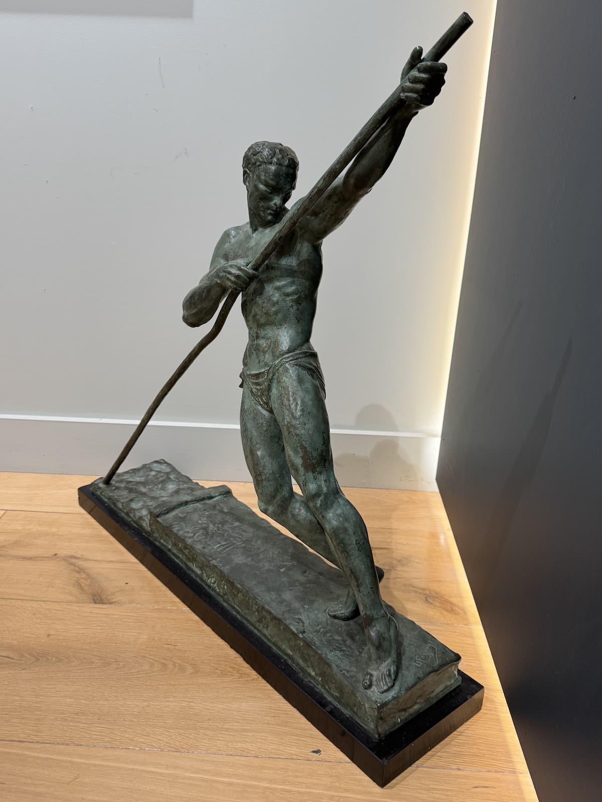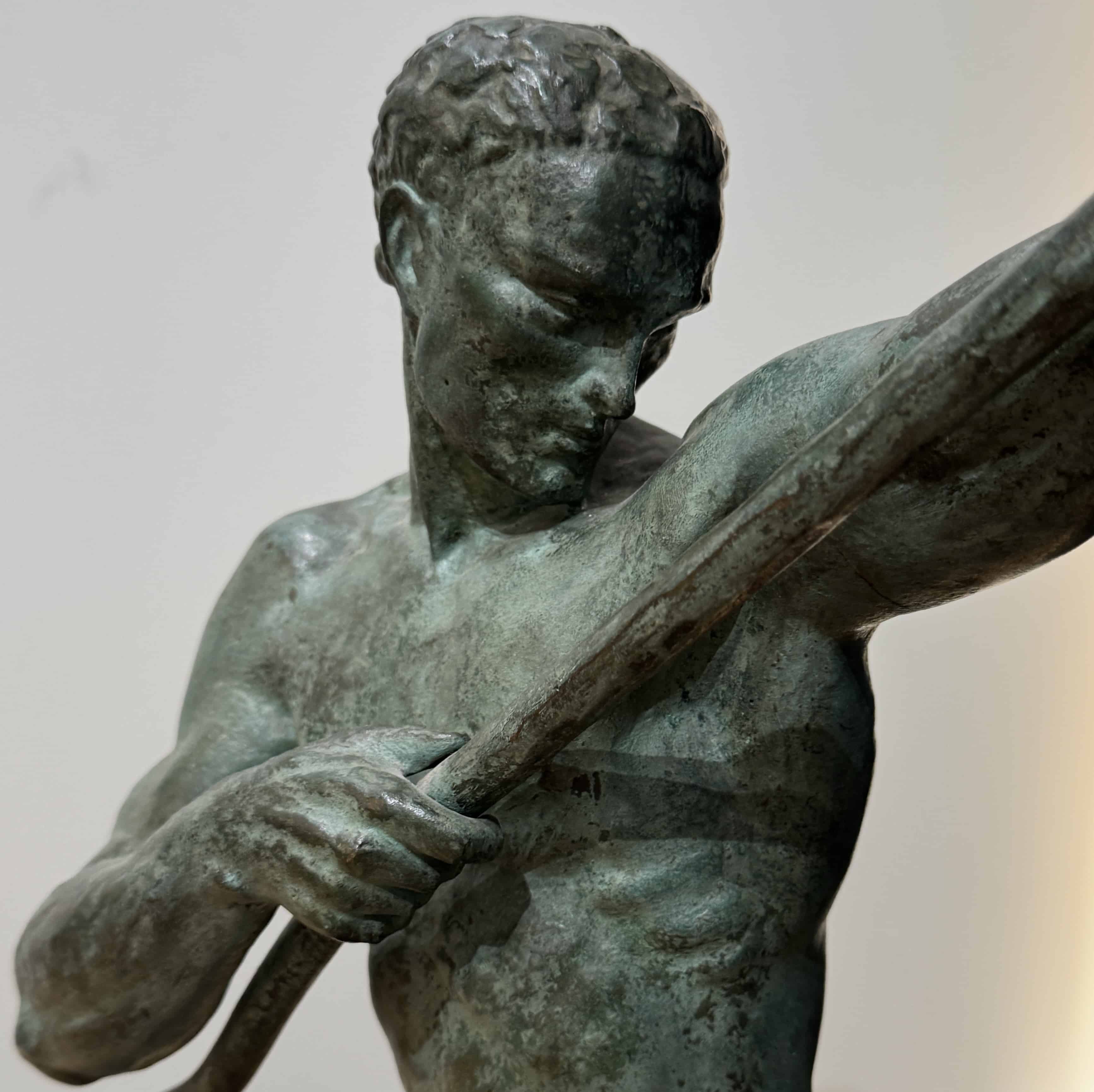 This dynamic bronze sculpture by the late French sculptor Pierre Le Faguays, depicts a powerfully built male athlete captured in the midst of an intense, forward-driving motion. The figure is shown in a deep lunge, muscles taut and elongated, as he braces a long pole with both hands. His torso twists subtly, emphasizing the athletic tension and fluid movement characteristic of Le Faguays’ Art Deco style.