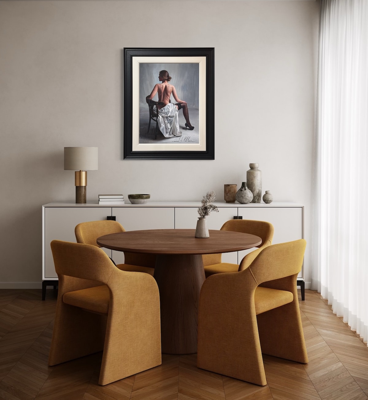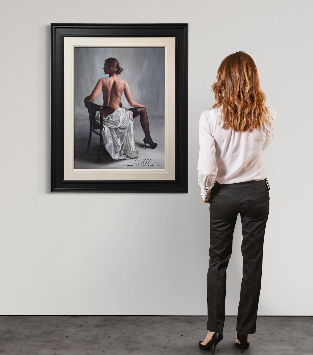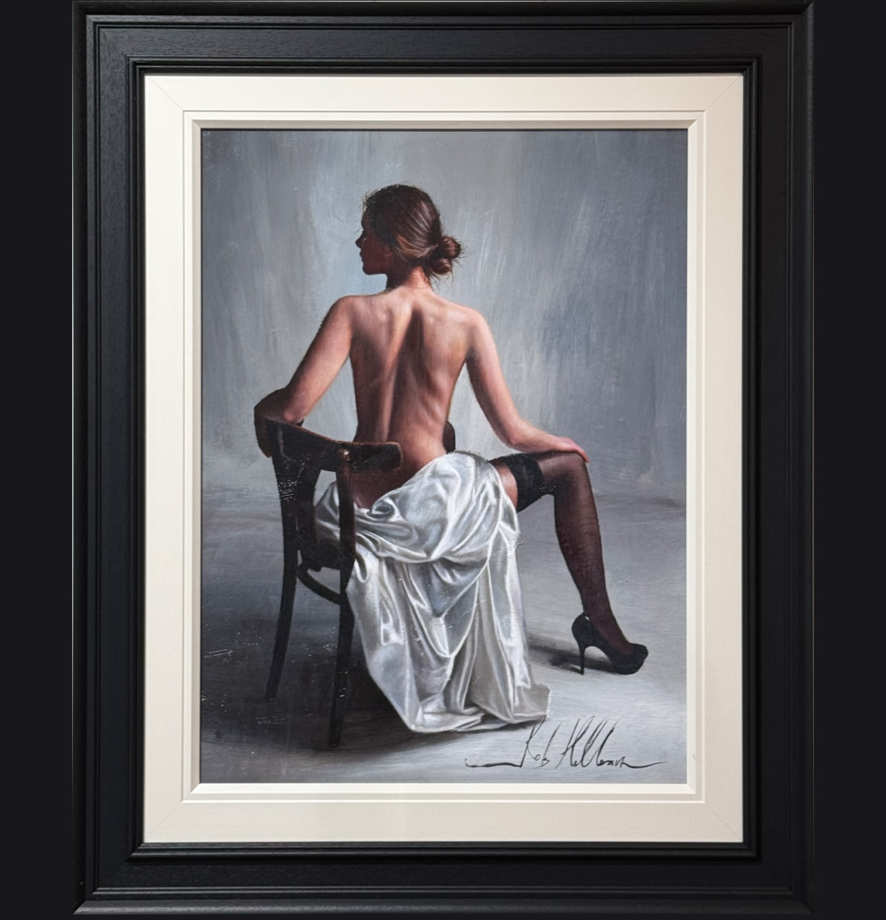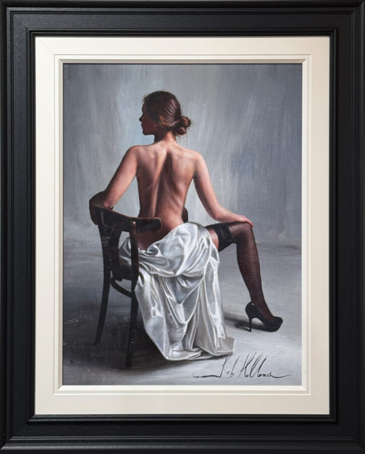 This figurative painting by Rob Hefferan showcases his hallmark style of hyperrealism and elegance. The artwork features a seated woman viewed from behind, exuding quiet confidence and sensuality.