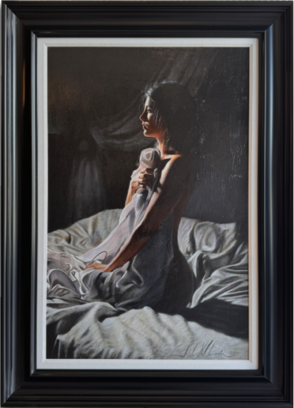 Signed by the artist in the bottom right corner, the piece is framed in an elegant black and white double frame, further enhancing its classical and refined presentation. Hefferan’s work often celebrates the human form with beauty, dignity, and technical precision, and this painting is a strong example of that approach.