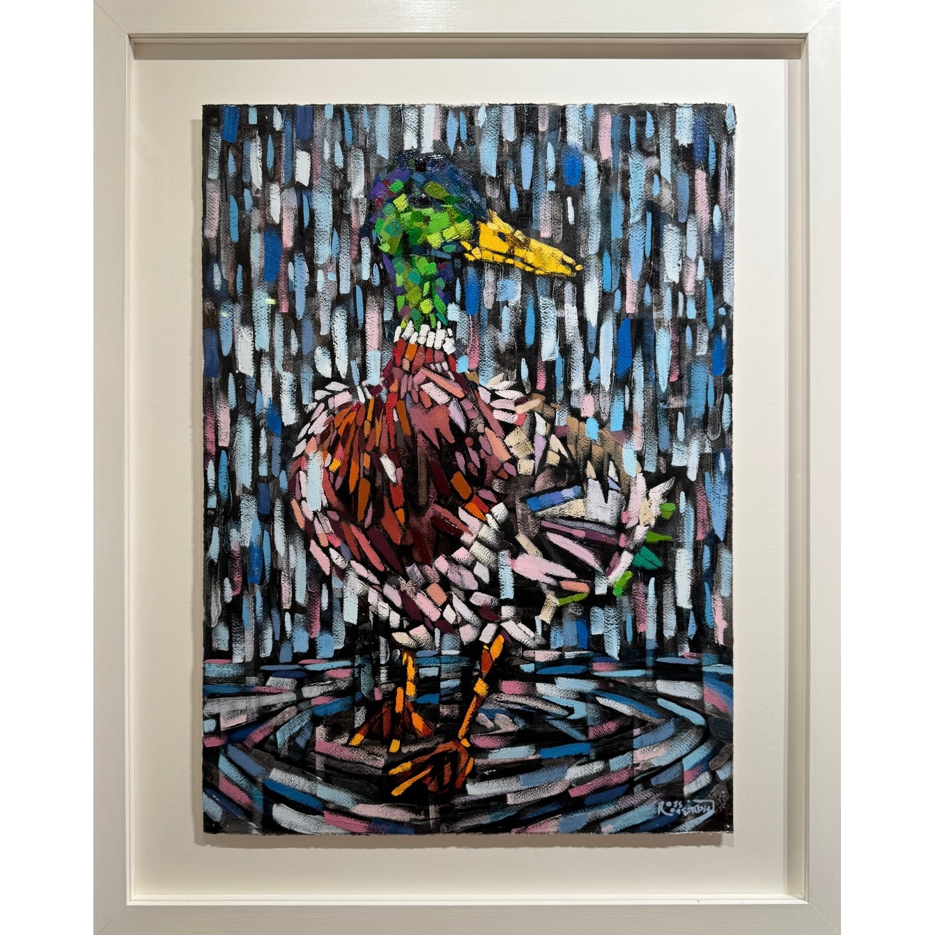 Capturing the attitude and charisma of a truly Mancunian Mallard, Ross brings his unique touch to this rainy scene. With his wonderful eye for colour and composition, Ross brings a whole new dimension to what could be a somewhat mundane scene when captured by many. Another fabulous painting by Ross Constable beautifully presented in a hand painted white frame.