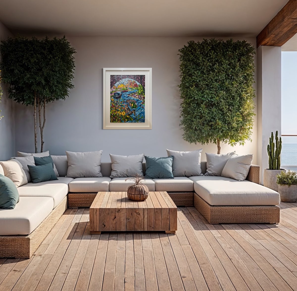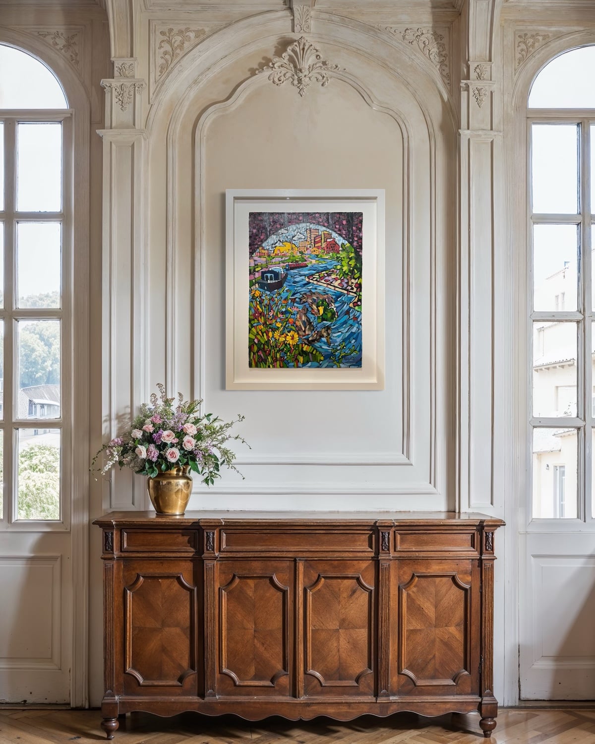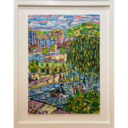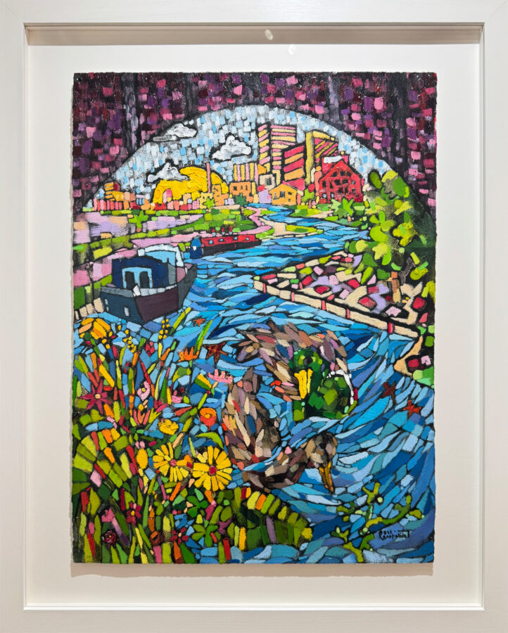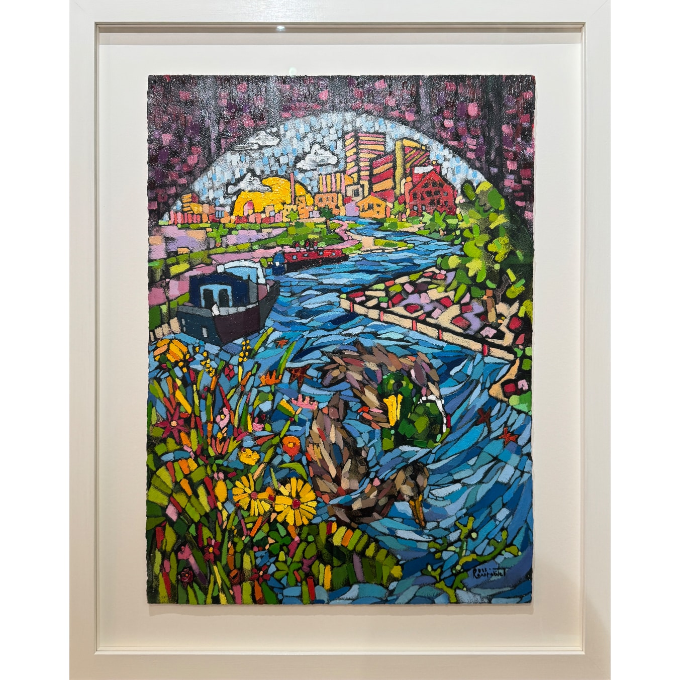 Nagomi, meaning emotional balance in Japanese, is a wonderful composition by Cheshire artist Ross Constable inspired by Japanese art.  Taking inspiration from Japanese artist Hokusai, Ross uses a Yin and Yang motif with the ducks in the foreground grounding the composition in nature as the viewer is taken along Manchester’s waterways into the city.  The bridge which frames the upper region of the painting references Valette’s bridge paintings which went on to to inspire his student and Manchester’s most famous artist, L S Lowry.