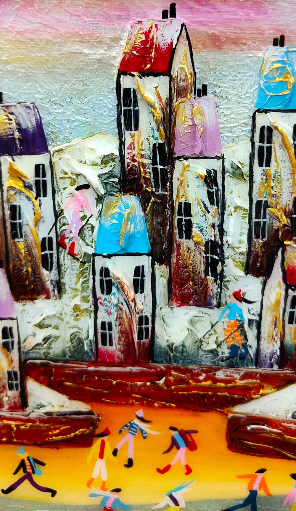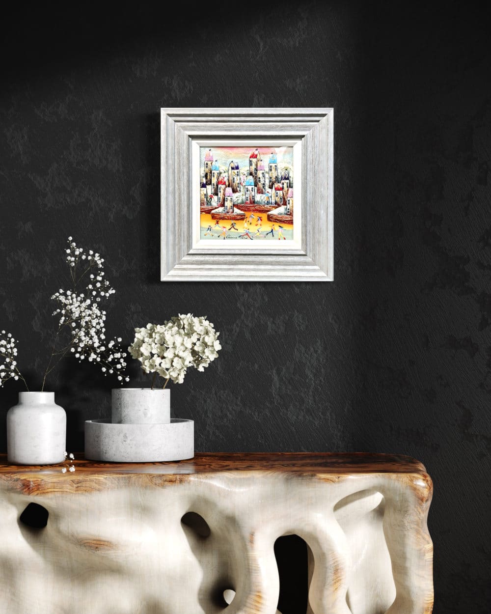 Original mixed media painting of a busy lakeside beach scene by artist Rozanne Bell. Utilising textures capturing the light, and emphasising the movement of the people within, this original Rozanne Bell artwork is professionally framed and is signed by the artist.