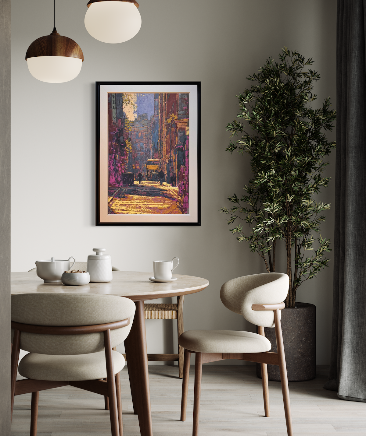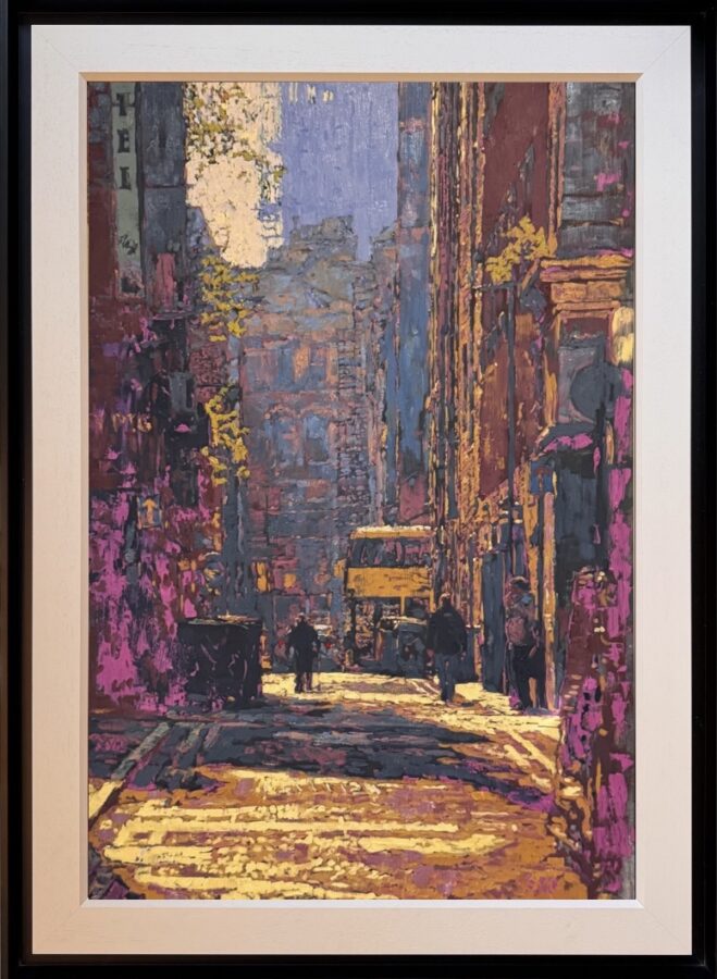 Original cityscape painting of Manchester city centre by North West artist Stephen Campbell. Using his own made pigments, Stephen captures the wonderful light of central manchester in the Piccadilly area of the city. Signed and titled to the reverse and professionally framed.