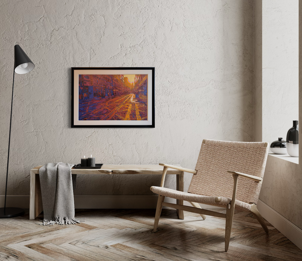 Original cityscape painting of Manchester city centre by North West artist Stephen Campbell capturing the bursting city light of Mosley Street.  Signed and titled to the reverse and professionally framed.