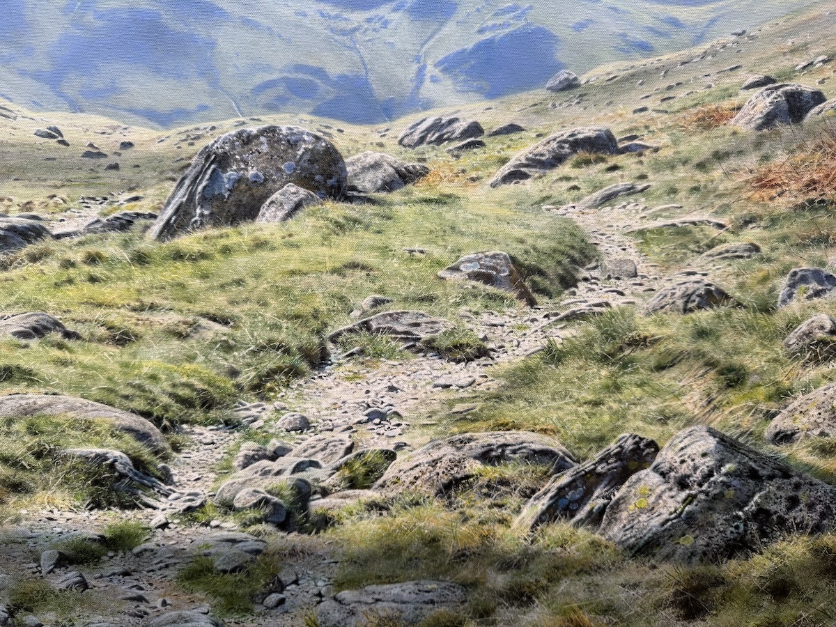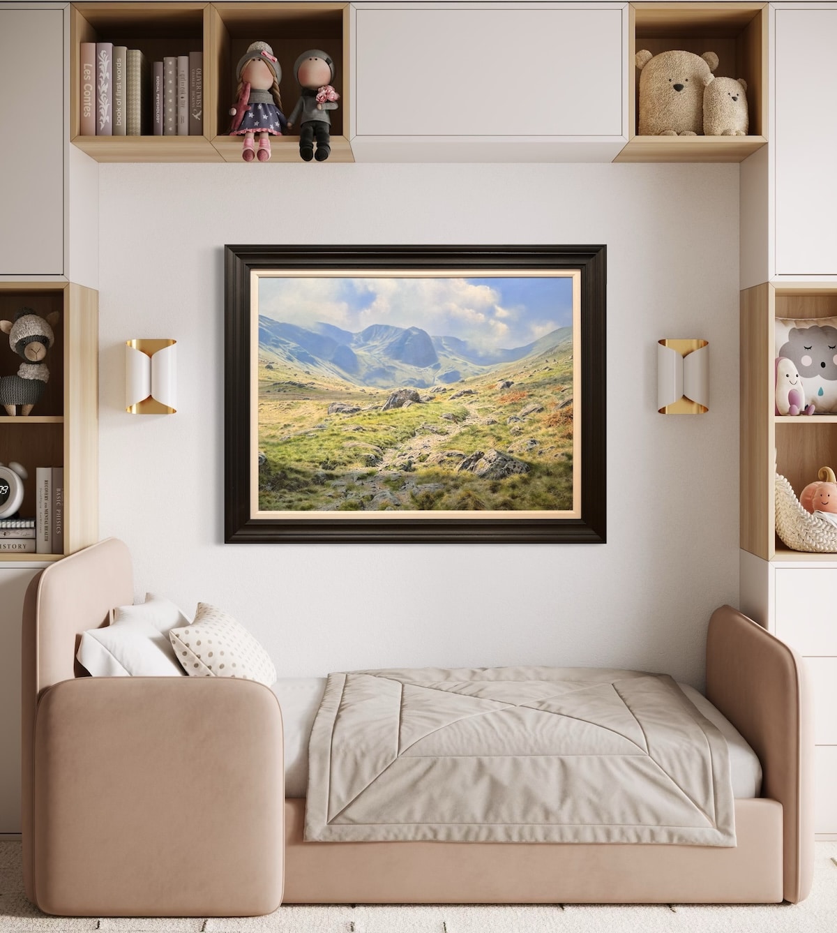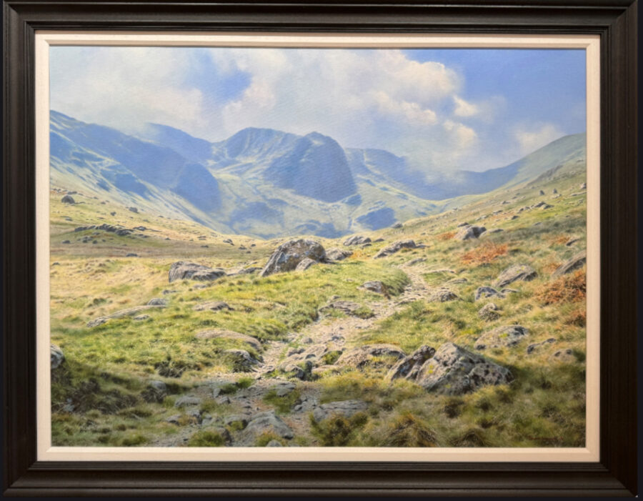 This painting presents a majestic view of Fairfield, as seen from Deepdale, a remote and rugged valley in the Eastern Fells of the Lake District. The artist has masterfully captured the drama and serenity of the landscape, with remarkable attention to light, texture, and atmosphere