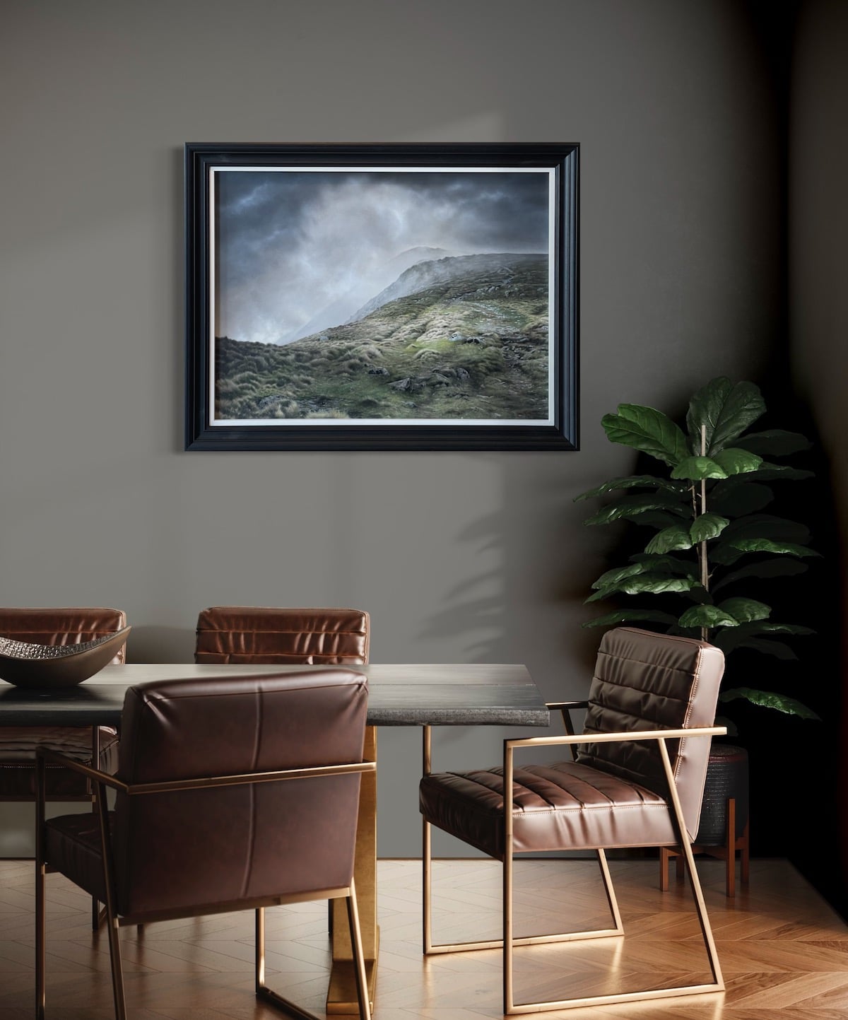 A captivating and mysterious painting capturing the weather descending over the peaks. Painted in Steven Townsend’s recognisable photo realist style, he really captures the feel and power of the weather as it descends over the hill tops. Painted in acrylics on canvas, the painting is beautifully framed and signed by Steven Townsend.