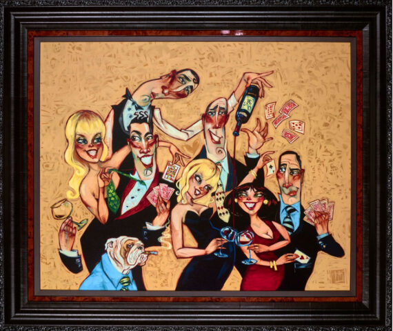 ‘All Bets Are Off’, by American artist Todd White, is an embellished print presented as a canvas on board artwork, measuring 34 x 28” and released as a limited edition of 100. This fun and feel-good piece of art, in its chic frame, depicts one of the artist’s popular party scenes with a cast of characters dressed to the nines and having a whale of a time, playing cards and drinking wine. The ruddy-cheeked party people in their sharp suits and best dresses of red and black are set against an apt background of rich gold.