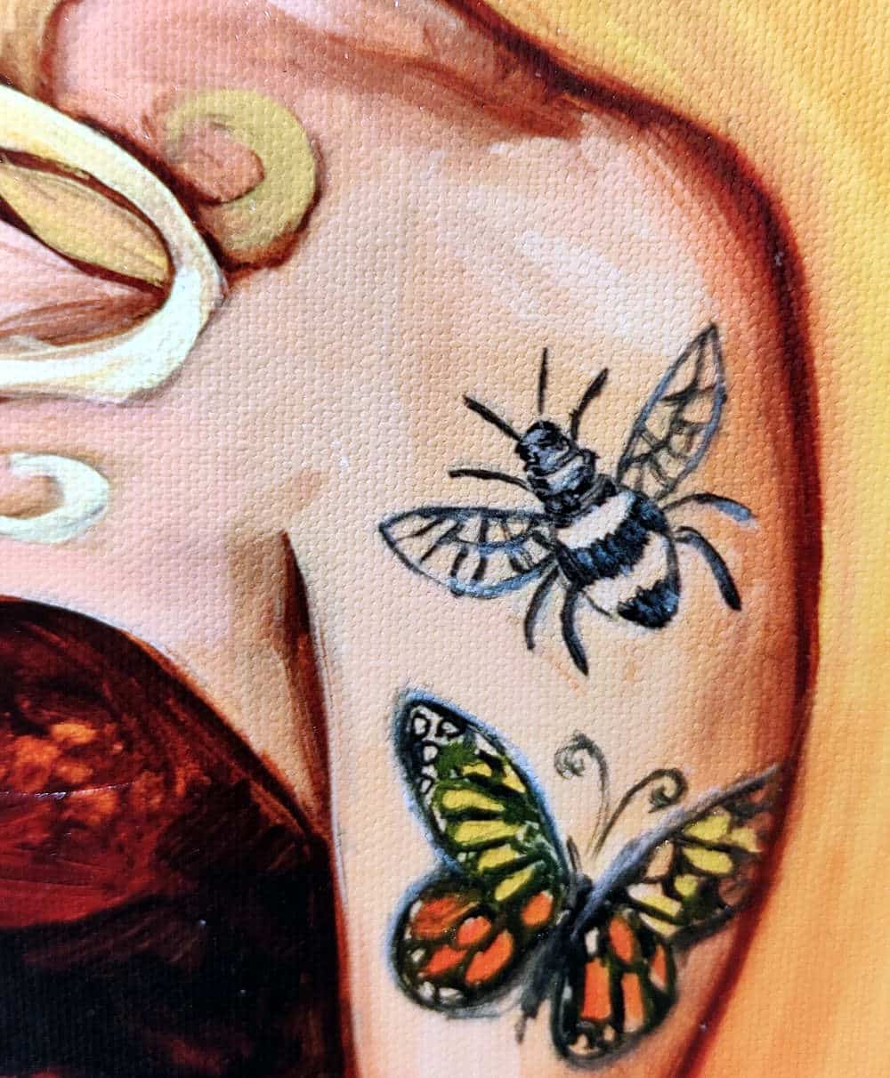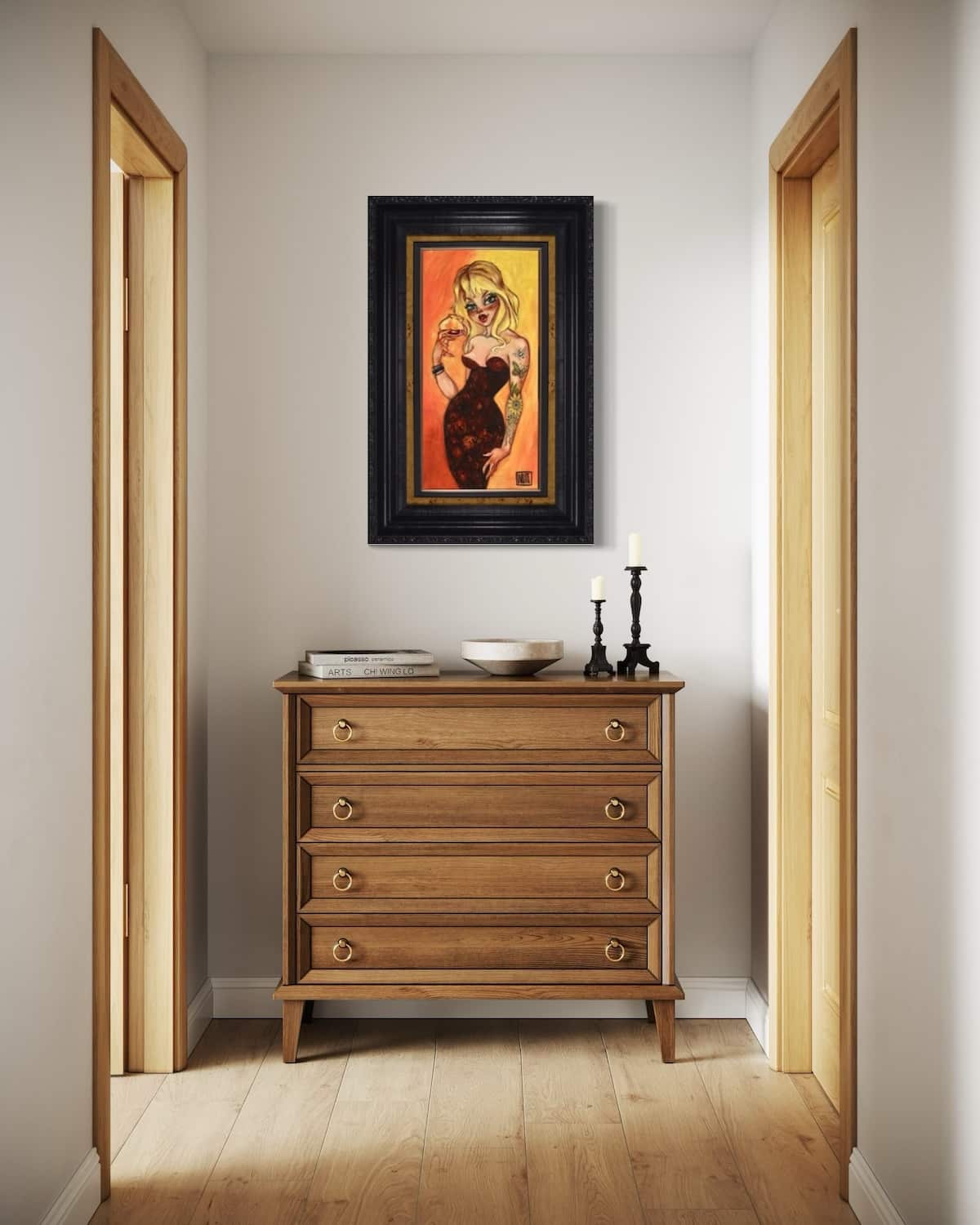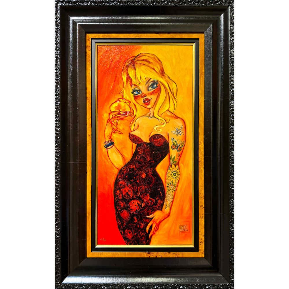 “This is a painting about a woman I know, she had a really terrible upbringing and a broken home. Dad wasn’t around much, mom left. She pretty much raised herself and while she might be tough as nails in that process, she didn’t have direction. Therefore, she had to figure everything out and made a lot of mistakes. Sometimes it’s hard to shake where you come from, and you find yourself on that same path. She still makes some bad decisions from emotional damage. Her saving grace is at her core she has a really good heart. People like that have to go through their own journey and where they end up is unpredictable. I think we all know people like that and I have a saying everybody is where they’re supposed to be. The decisions you make in life lead you to where you are now.”