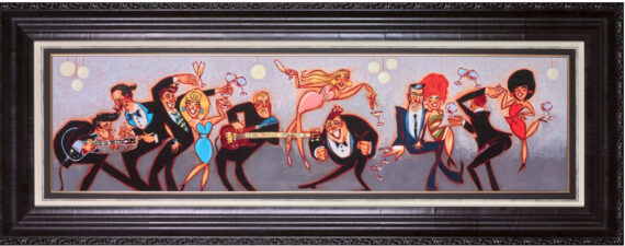 ‘Levitate’, by American artist Todd White, is an embellished print presented as a canvas on board artwork, measuring 43 x 12” and released as a limited edition of 100. This cool contemporary piece, in its chic frame, depicts one of the artist’s popular party scenes with a colourful cast of characters dressed to impress and having a good time – and in some cases spirits are lifted so high that they’re literally soaring! The almost monochrome colour palette of black, white and grey is accented by highlights of bright turquoise, coral pink and red.