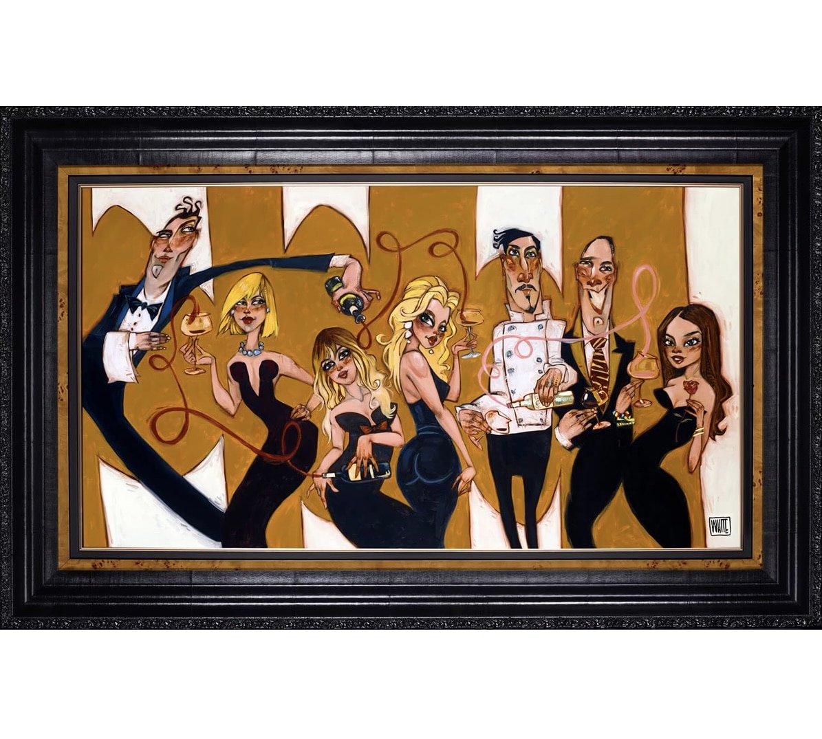 This witty and vibrant image from leading American artist Todd White captures the lively atmosphere of a glamorous party in a stylish palette of black, white and gold. The wine waiter’s elongated arm highlights the whimsical nature of the moment, red and white wine flowing in ribbons across the canvas straight into the glasses of the beautiful party people in their chic suits and little black dresses. Inspired by the artist’s fascination with wine culture and its transformative power, this artwork is a diverting comment on the shifting dynamics of a social gathering. As the wine flows, so do the hidden personalities, revealing a playful, more relaxed side to each character.